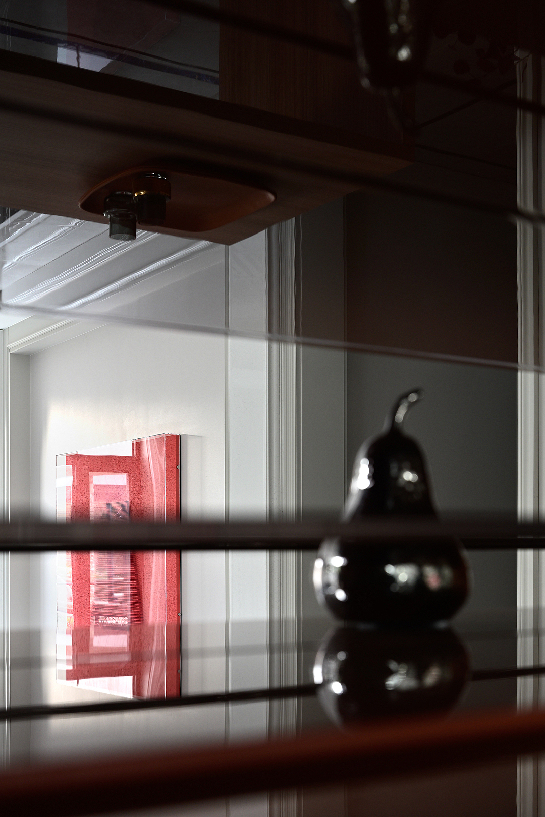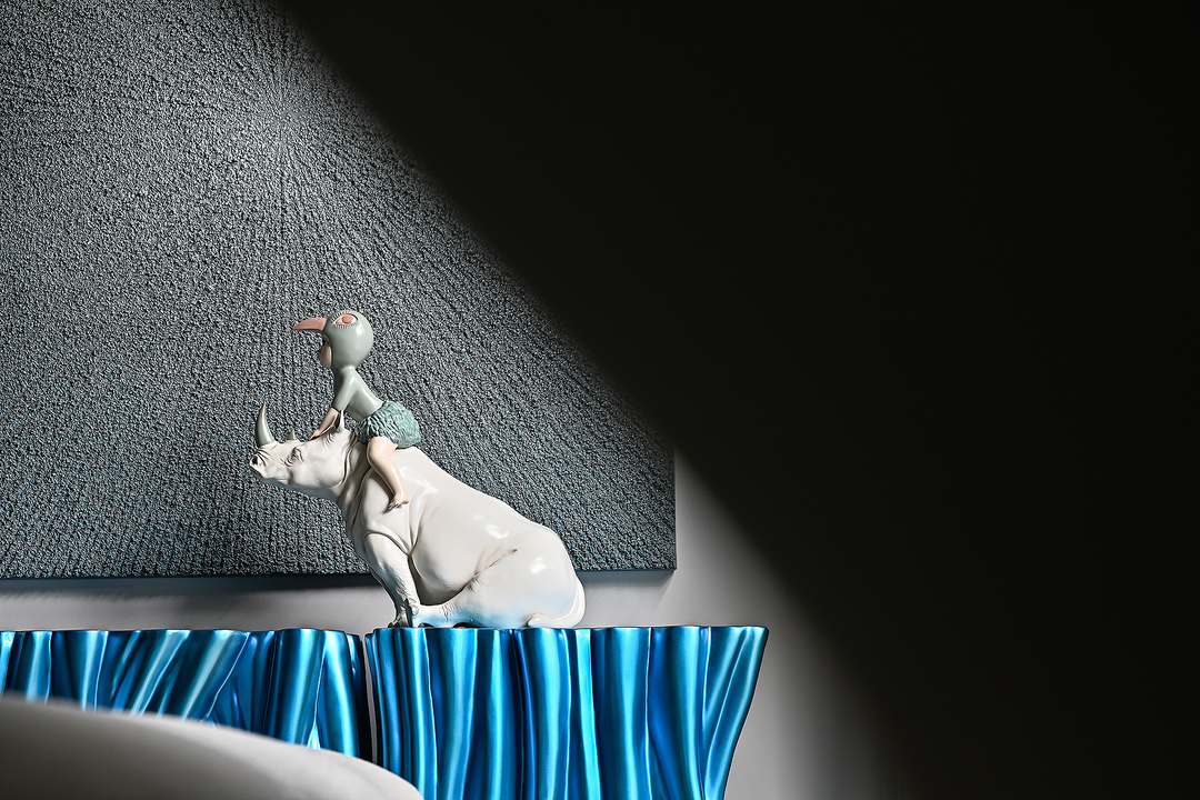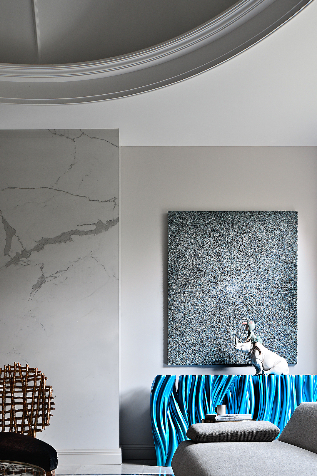 玄关摆放的湛蓝色画作是缓缓流动,变化着深浅色泽的海水,而水的流动默默地安抚着从纷扰烦嚣的外界归来的灵魂,让她回归本真。
