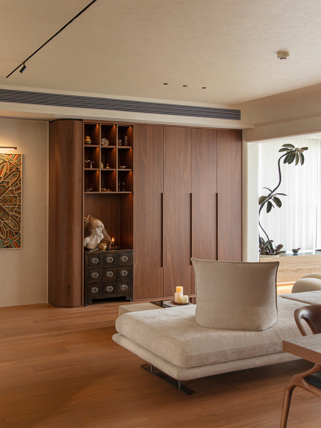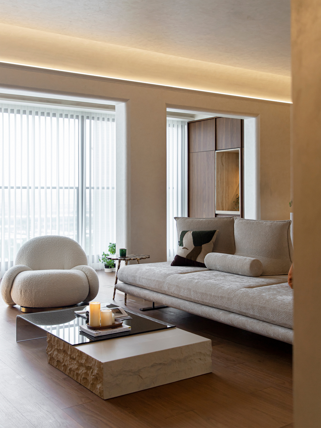 选用侘寂风洞石茶几,石灰石与玻璃材质碰撞,打消了空间内沉闷不自在的氛围,不流行于形式,回归本质的简约。