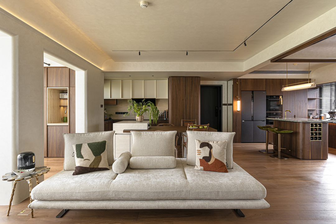 沙发则置于客厅中间区域,同时选用可随意坐或躺的双向沙发,让厨房、中岛餐桌、沙发三个空间居于十字轴线上,三者之间微妙的互动关系,为业主创造了更自由的生活方式。