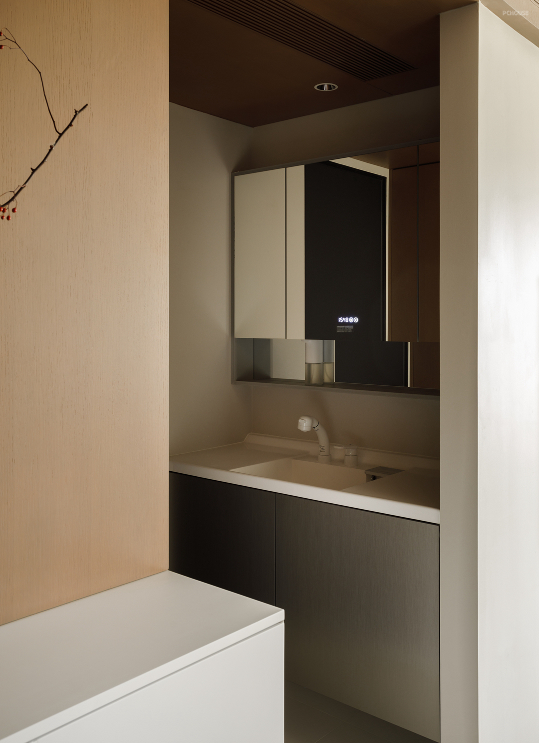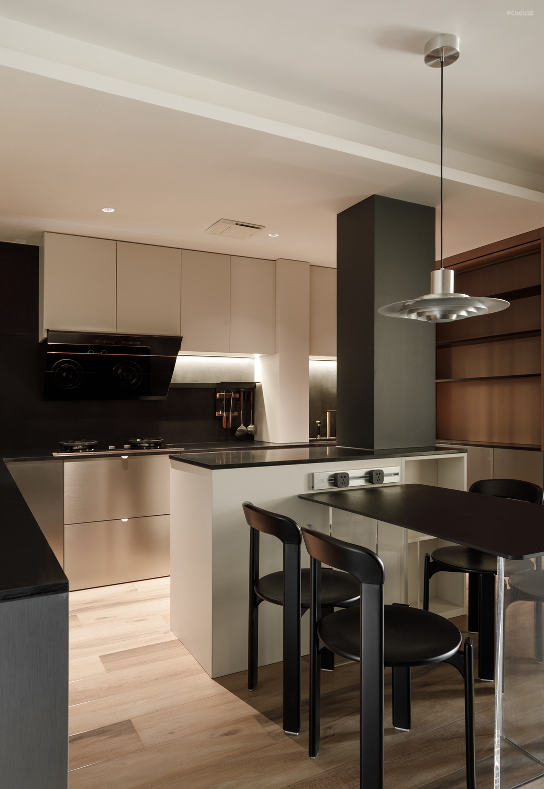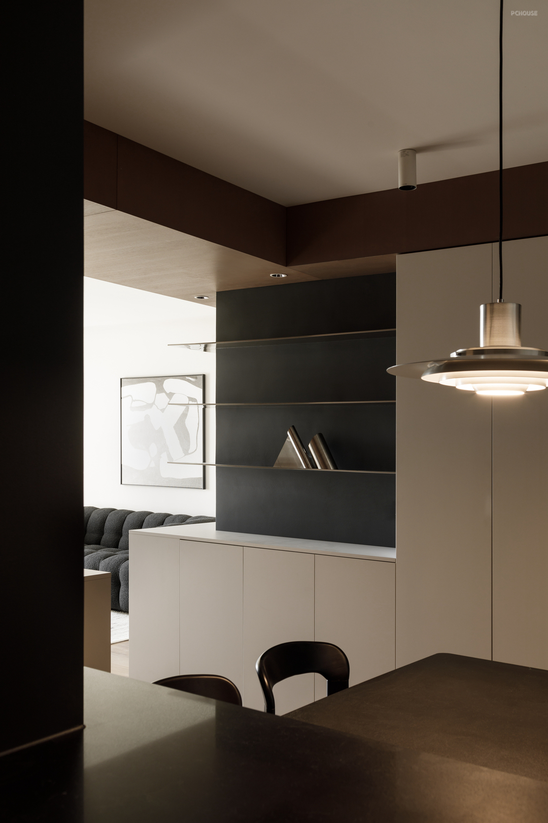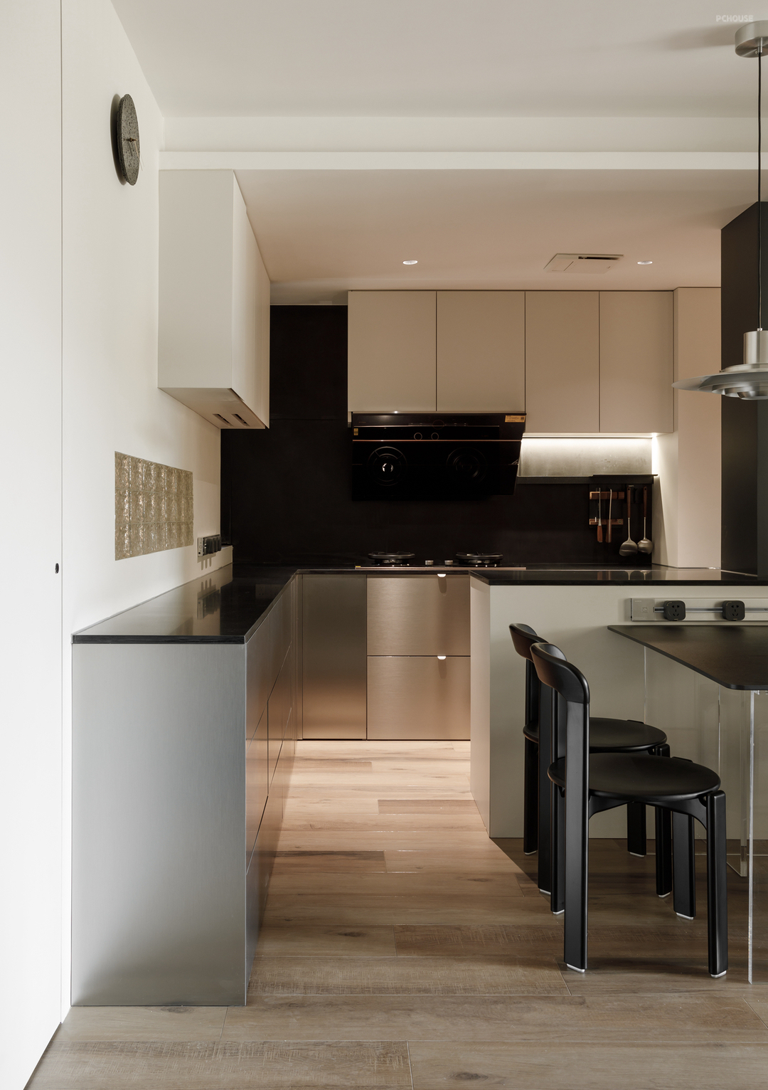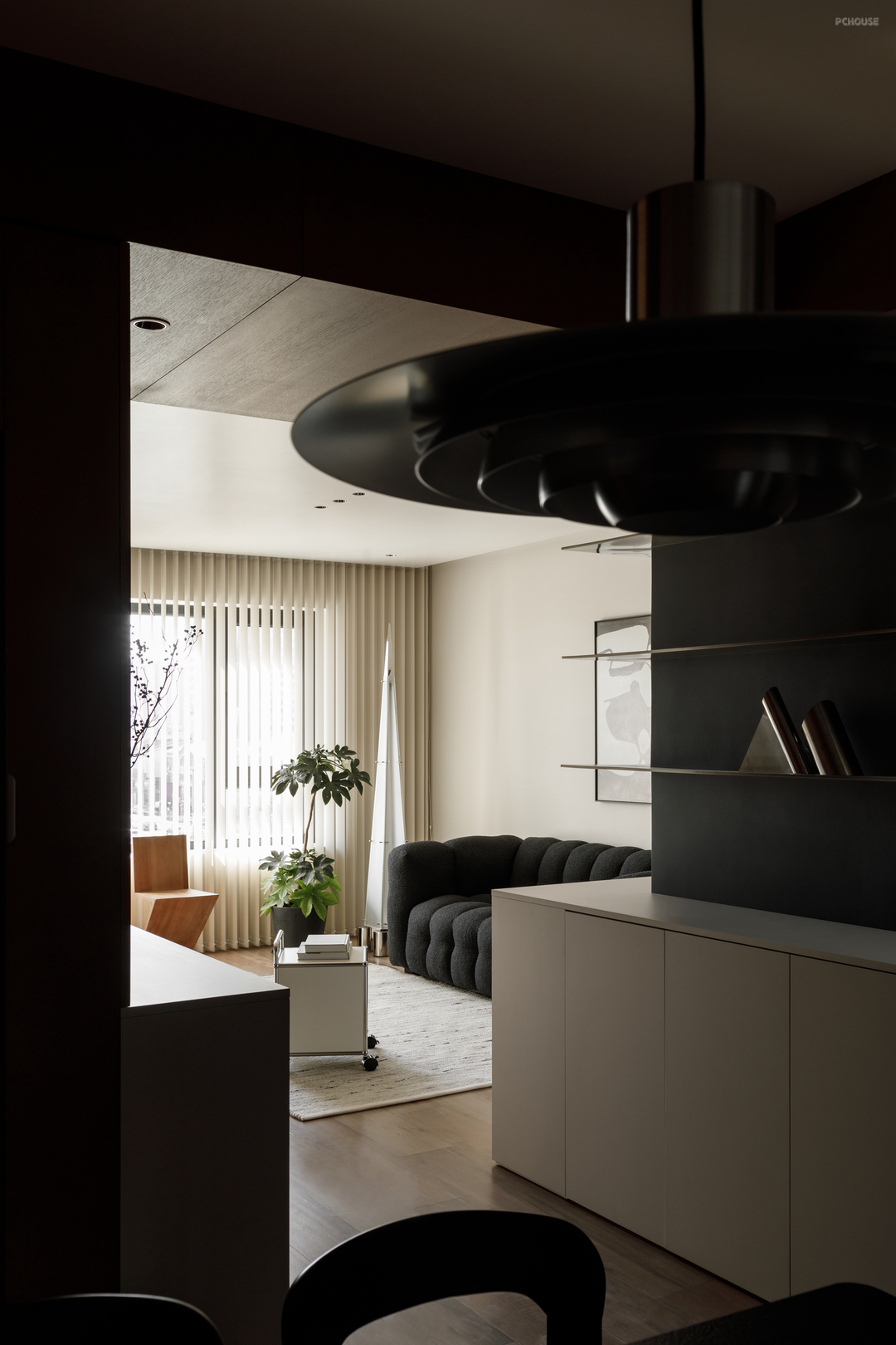 1.重新划分主卫和厨房空间,将厨房和餐厅结合起来,公用一部分空间,从而达到空间的利用和增加通透感;2.洗手台干区外置,将空间融入客厅的区域,使空间通透性最大化;3.餐厅与客厅连接的位置,底部设置了矮柜,保证充足的储物空间,上半部分镂空,大大改善了之前的窄视角。