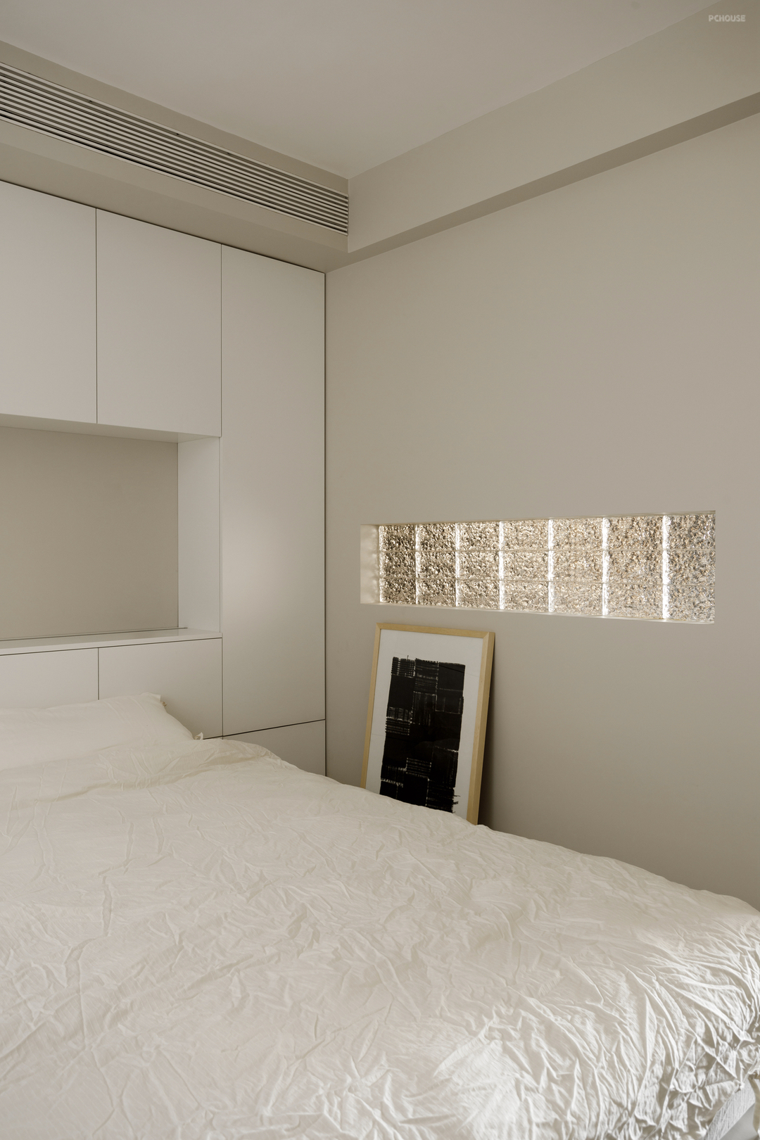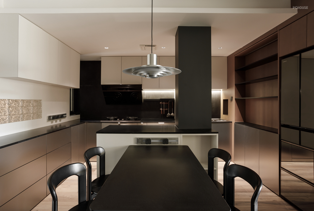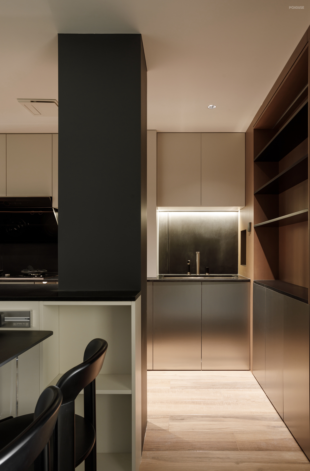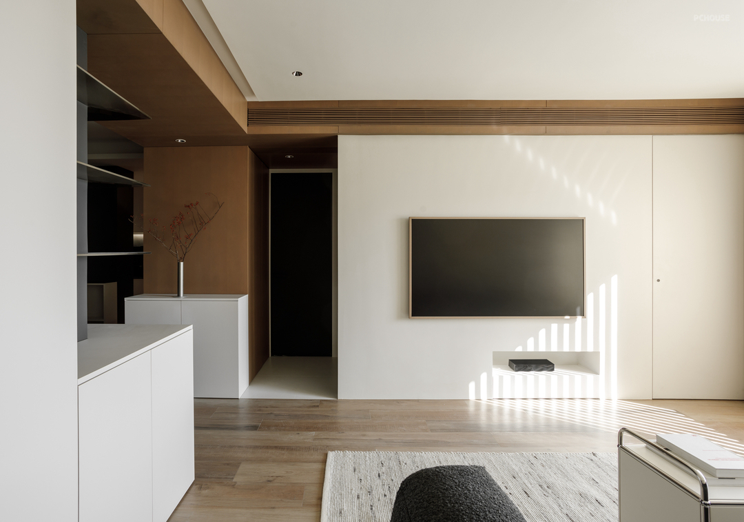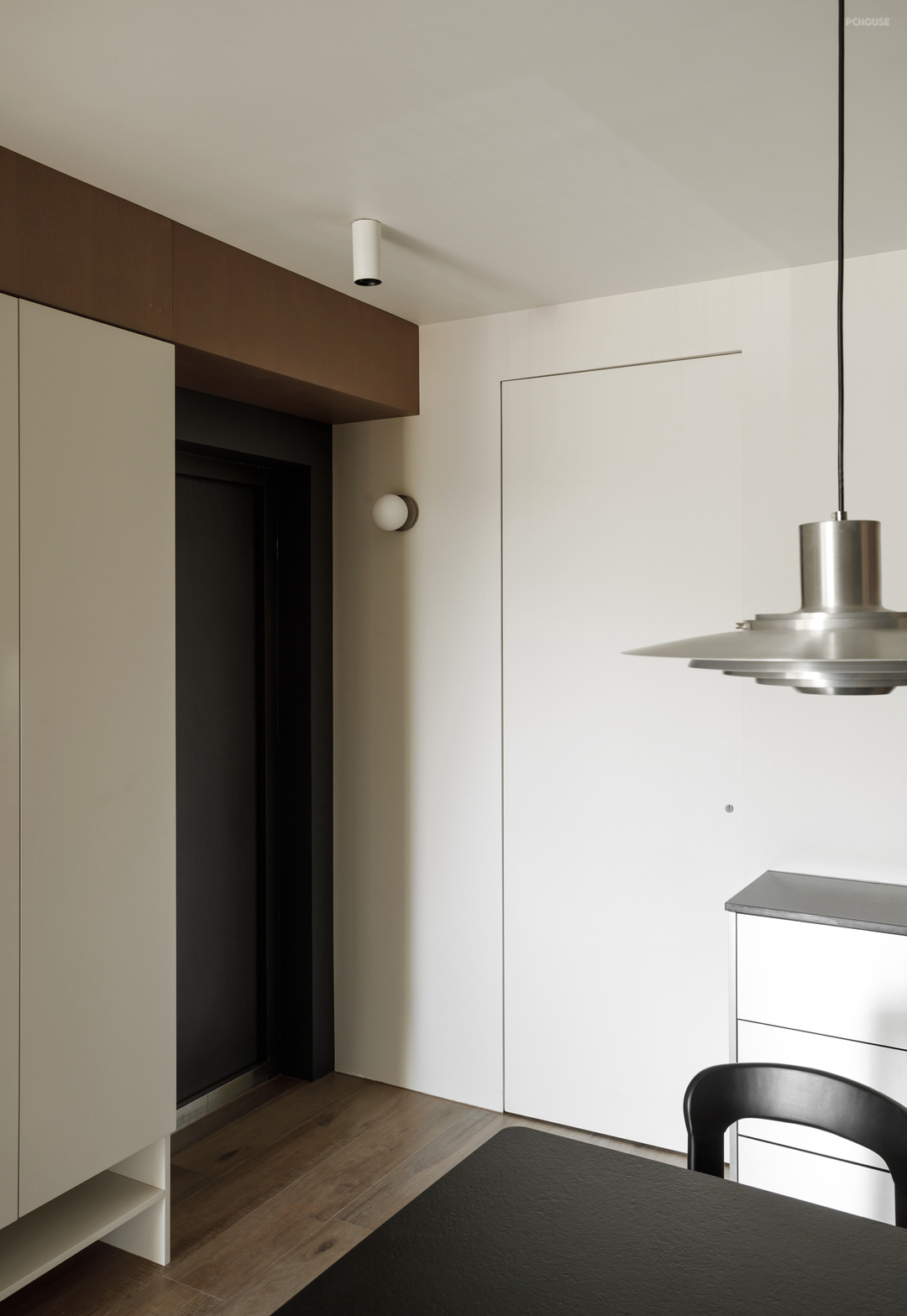 1.重新划分主卫和厨房空间,将厨房和餐厅结合起来,公用一部分空间,从而达到空间的利用和增加通透感;2.洗手台干区外置,将空间融入客厅的区域,使空间通透性最大化;3.餐厅与客厅连接的位置,底部设置了矮柜,保证充足的储物空间,上半部分镂空,大大改善了之前的窄视角。