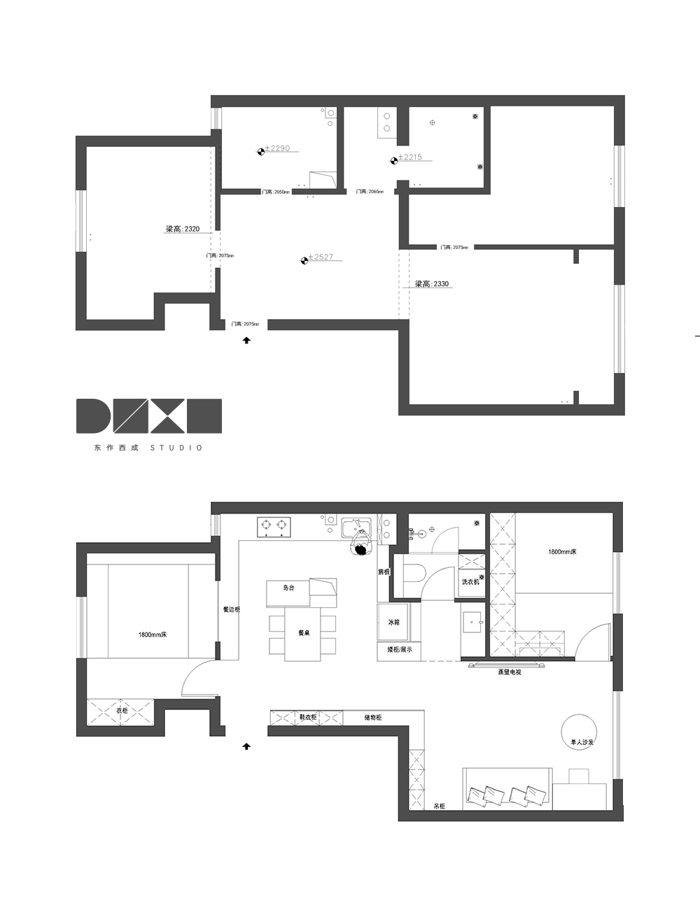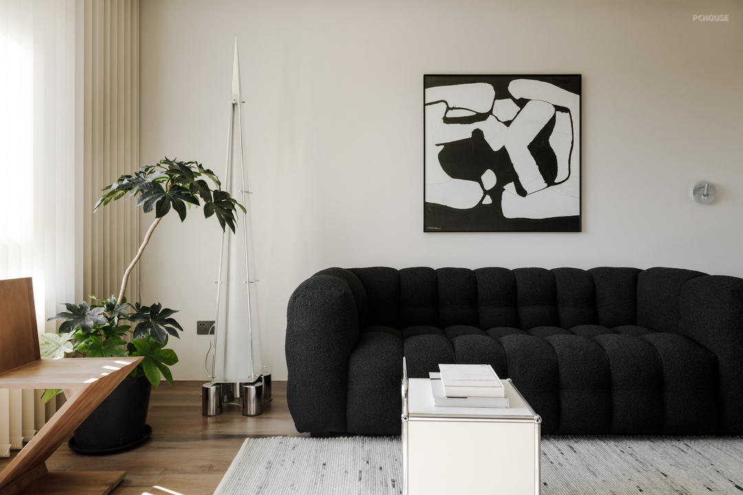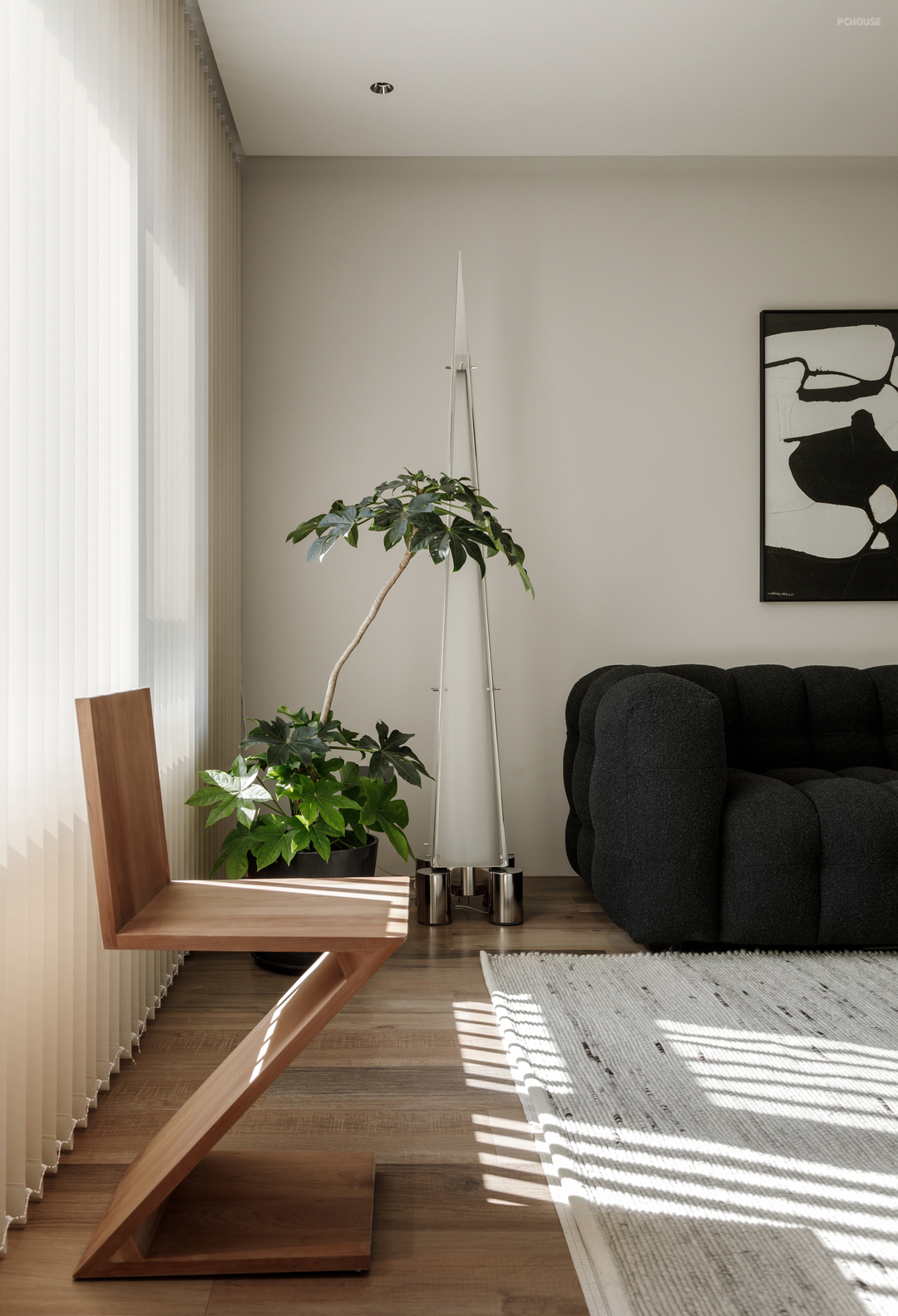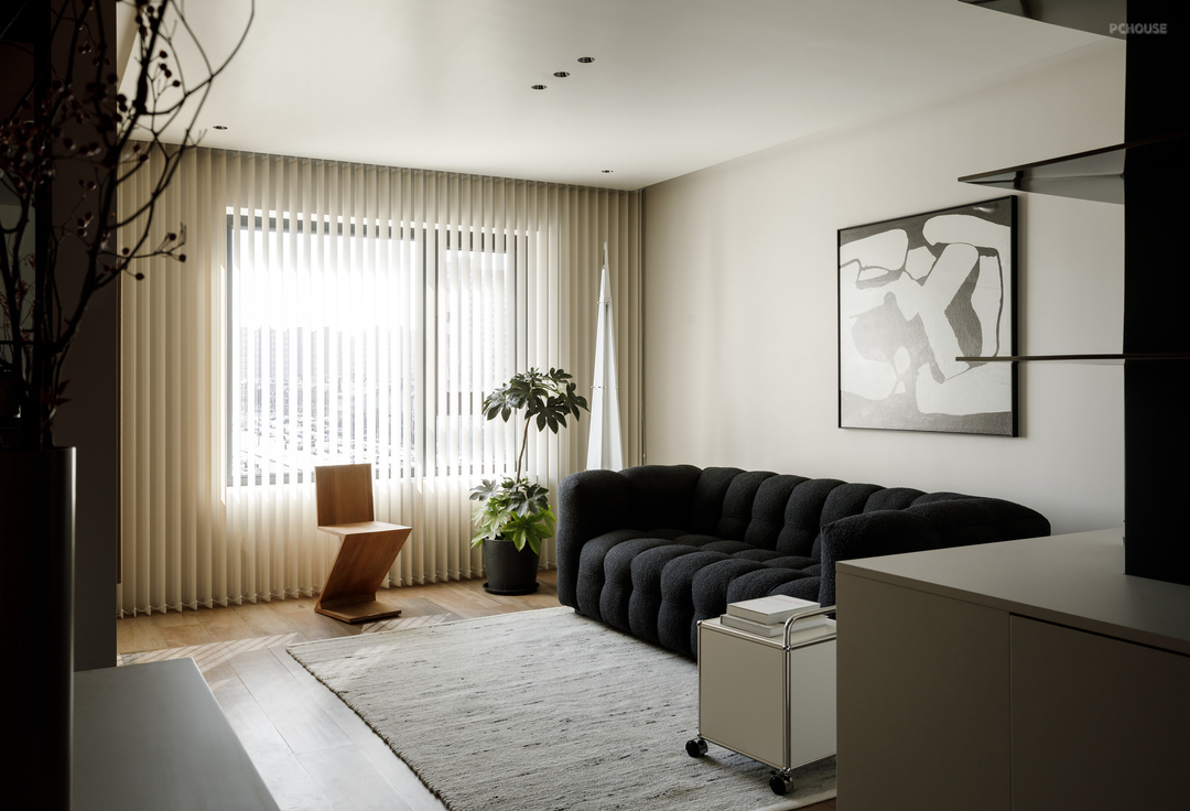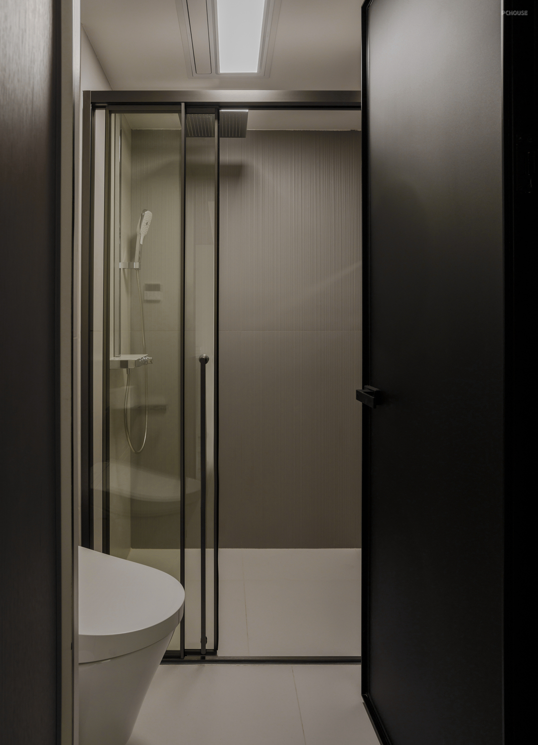 1.重新划分主卫和厨房空间,将厨房和餐厅结合起来,公用一部分空间,从而达到空间的利用和增加通透感;2.洗手台干区外置,将空间融入客厅的区域,使空间通透性最大化;3.餐厅与客厅连接的位置,底部设置了矮柜,保证充足的储物空间,上半部分镂空,大大改善了之前的窄视角。
