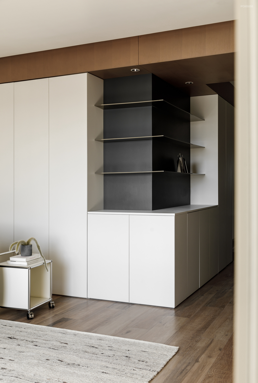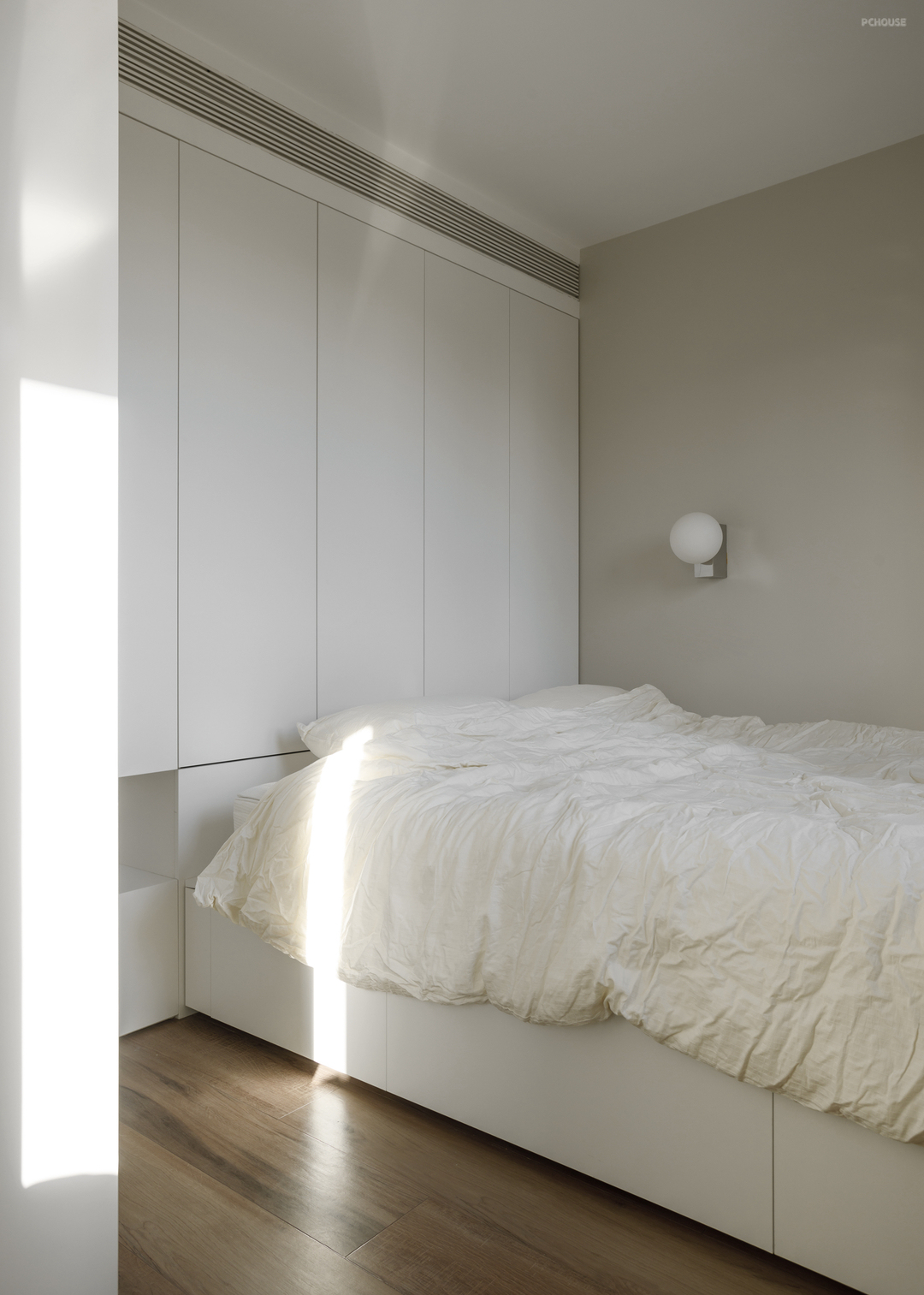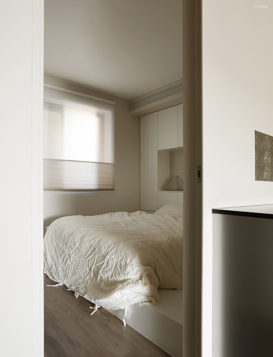 在这个空间里,保证了足够的储物空间,放弃了独立的厨房,放弃了舒适的独立床,让所有的门打开后都能很自然的融合起来,空间最大化。