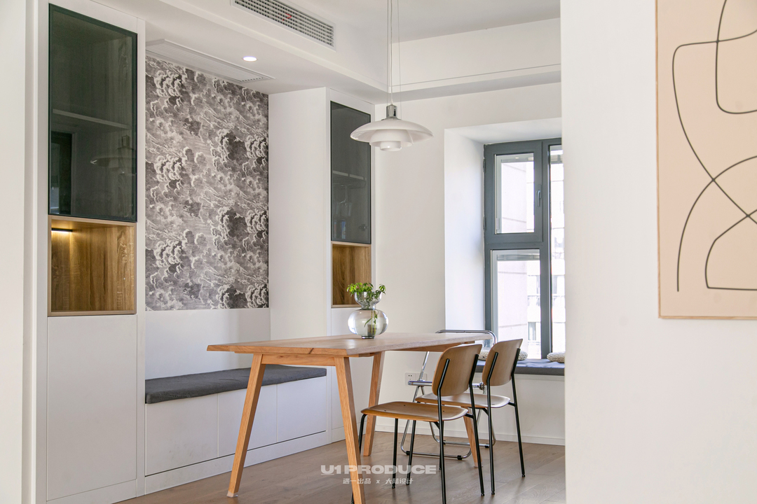 步入餐厅,清暖感被推至了更高的情绪点,木质方形餐桌与形态丰富的卡座,从质感上丰富了空间层次,清新质朴中透露着人间烟火的宁静诗意。