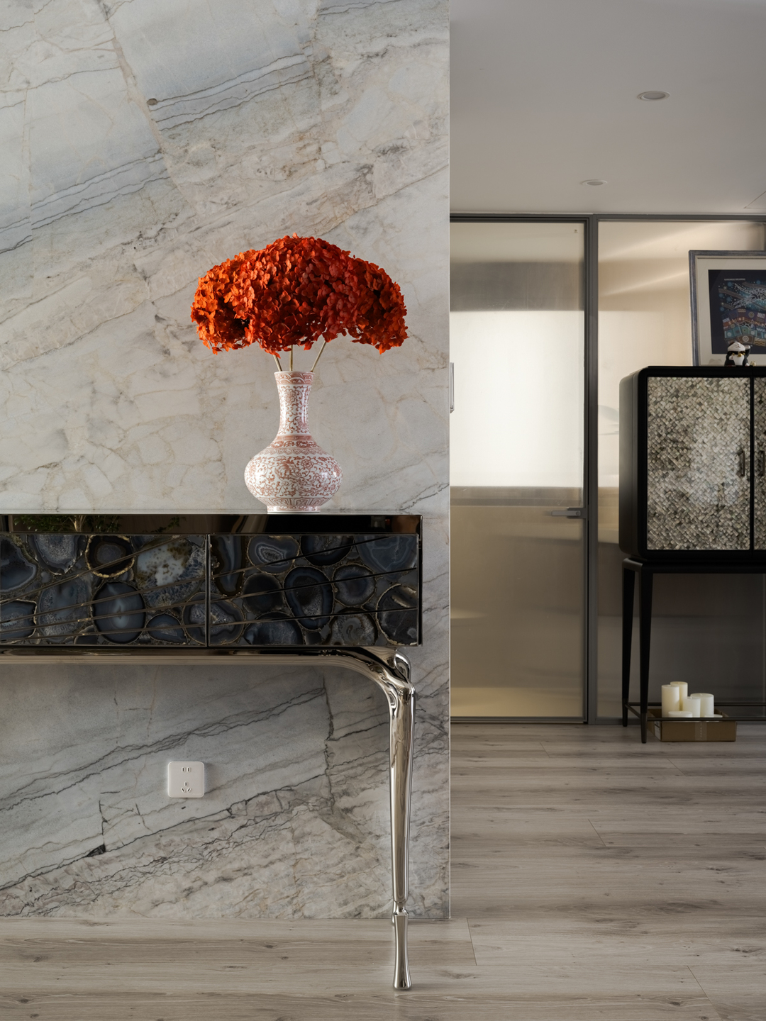 过道尽头,大理石墙下搭配精致的玄关柜和艺术花植,材质和色彩在这里交织出一幅生动的画面,生机和活力充盈其中,仿佛荡起生命的涟漪。