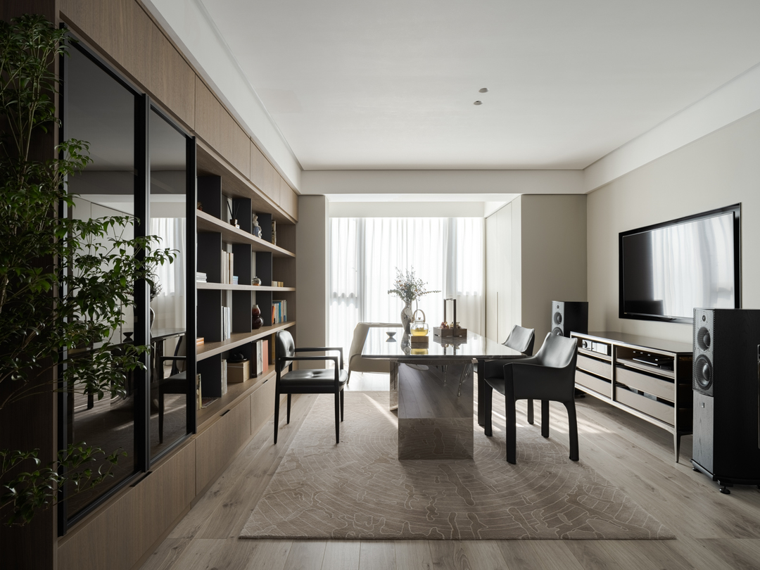 这里传统空间的框架被打破,客厅拓展了茶室、书房等使用场景,结合格调高雅的家居,构建符合居者气质的令人愉悦的精神场域。