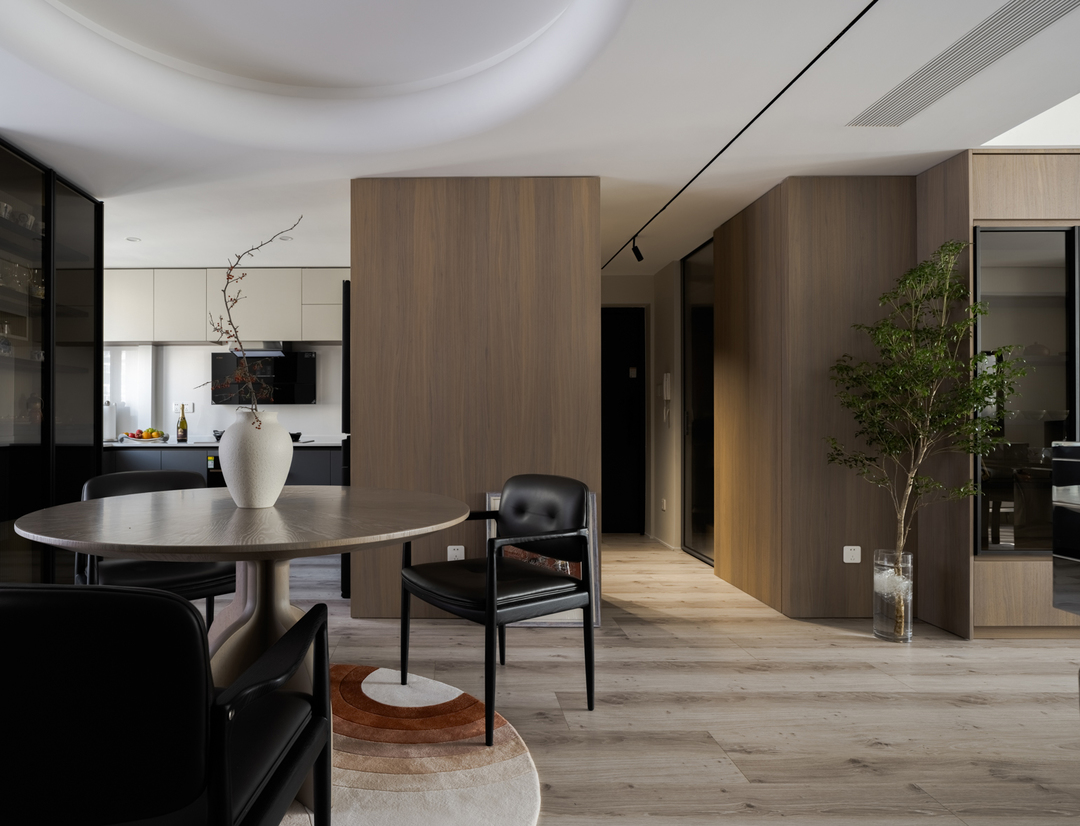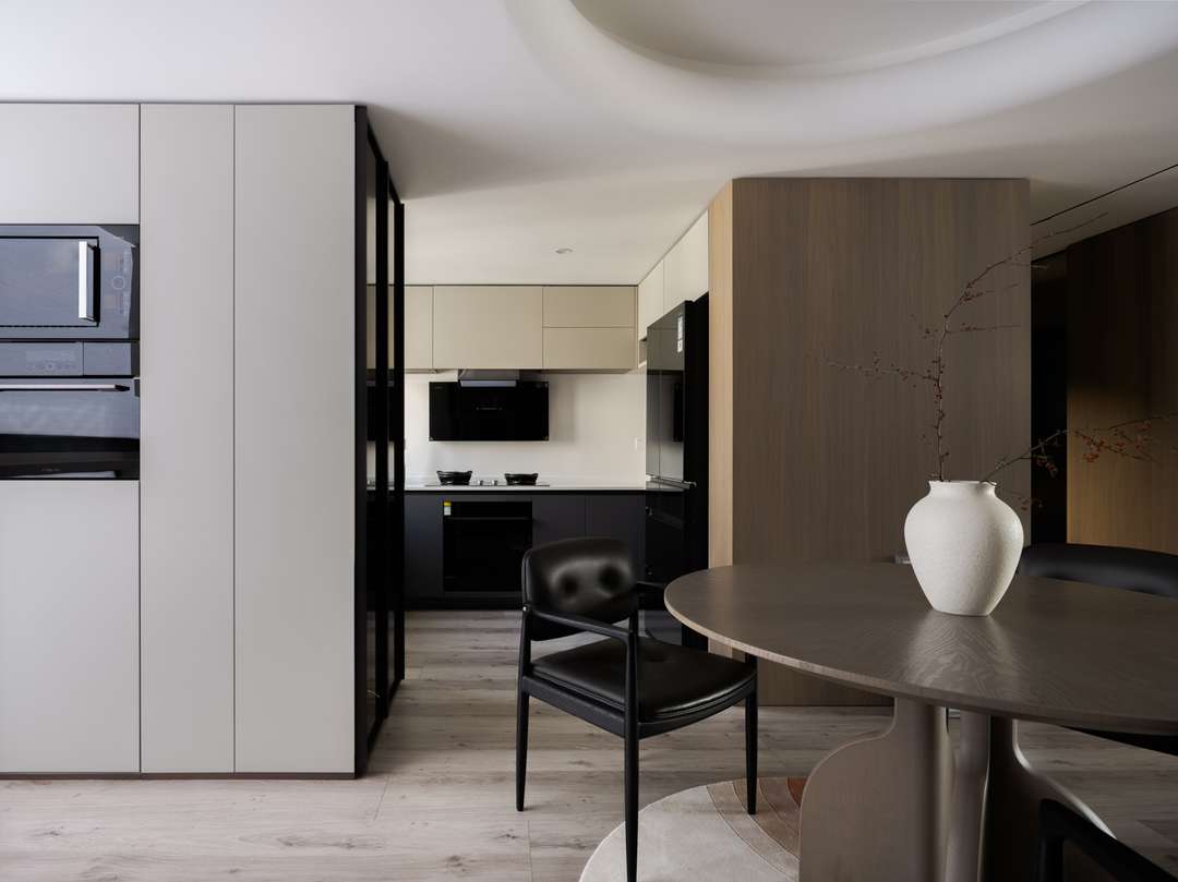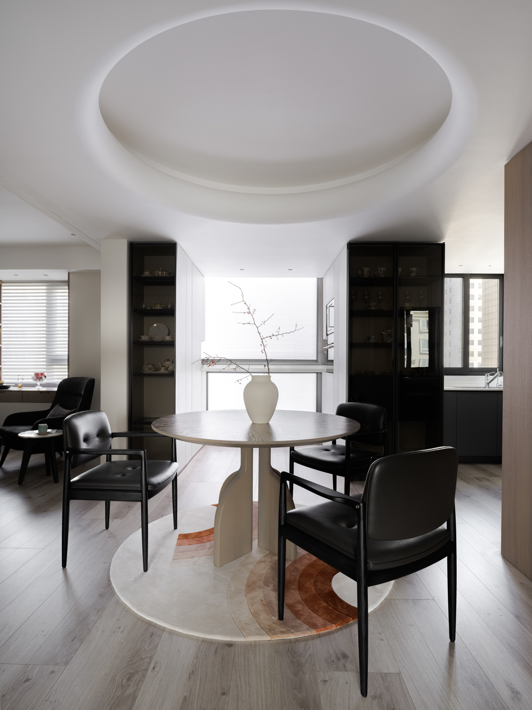 用餐区弥漫着柔和高雅的气氛,温润的圆桌、廖静感的陶瓷花枝,搭配意式品质感的黑色座椅,围合该区的赏心悦目,让人在这片区域的精神也得到放松和愉悦。