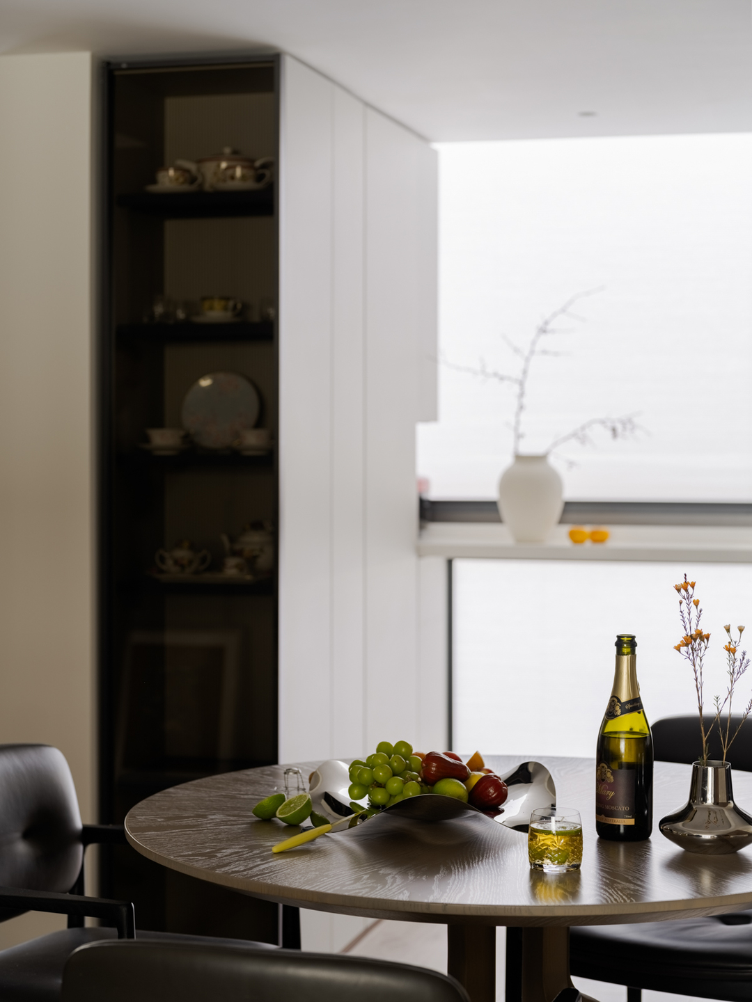 北阳台靠窗处规划吧台,提供多样化的娱乐生活场景。吧台区两侧设计收纳展示柜,烤箱等设备。展示架有条不紊的精致器具,呈现收纳秩序美学艺术,亦彰显屋主对生活的热爱,以及有条理、优雅的生活态度。