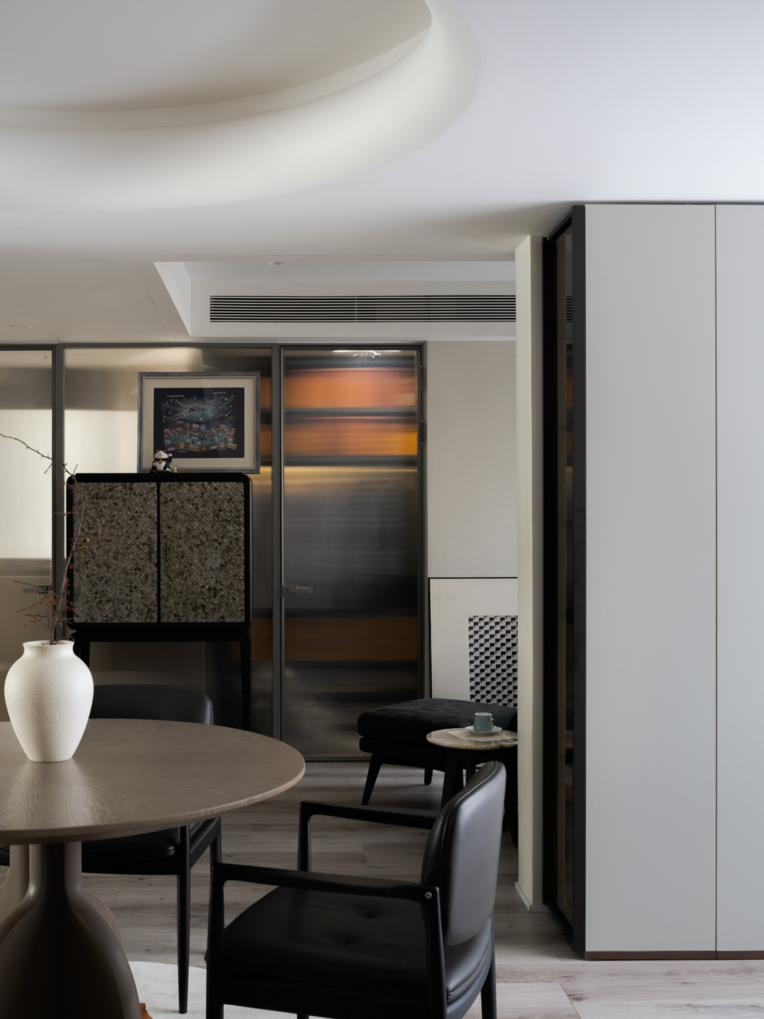 设计充分考虑了屋主的生活形态和审美品味,重组空间架构,将多个生活空间贯通、渗透,借助色彩与材质,围合空间独有的气质,形成虚实相生、明暗交错的丰富层次,构建家文雅静谧的的气韵、秩序和安宁。希望归家居者便卸下周身防备与胜负计较,与爱人与自己愉悦相处,享受灵动而从容的生命状态。
