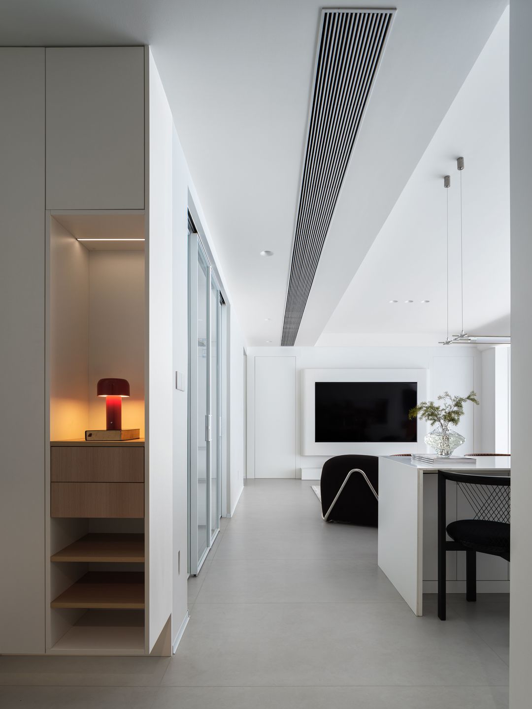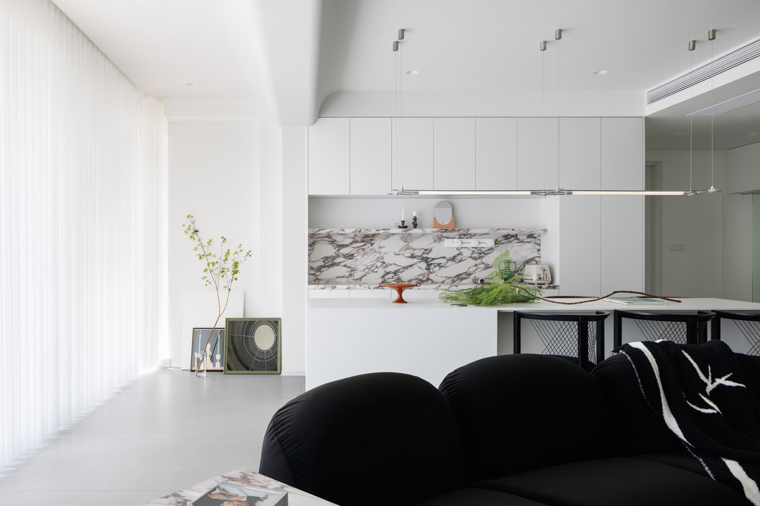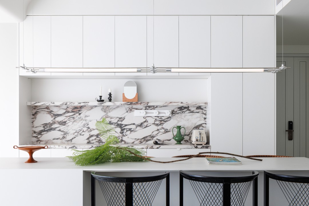 餐岛台背后的操作、展示柜则进一步强化了空间的实用性。这一设计巧思不仅提供了额外的储物空间,同时为业主创造了个性化的展示空间。