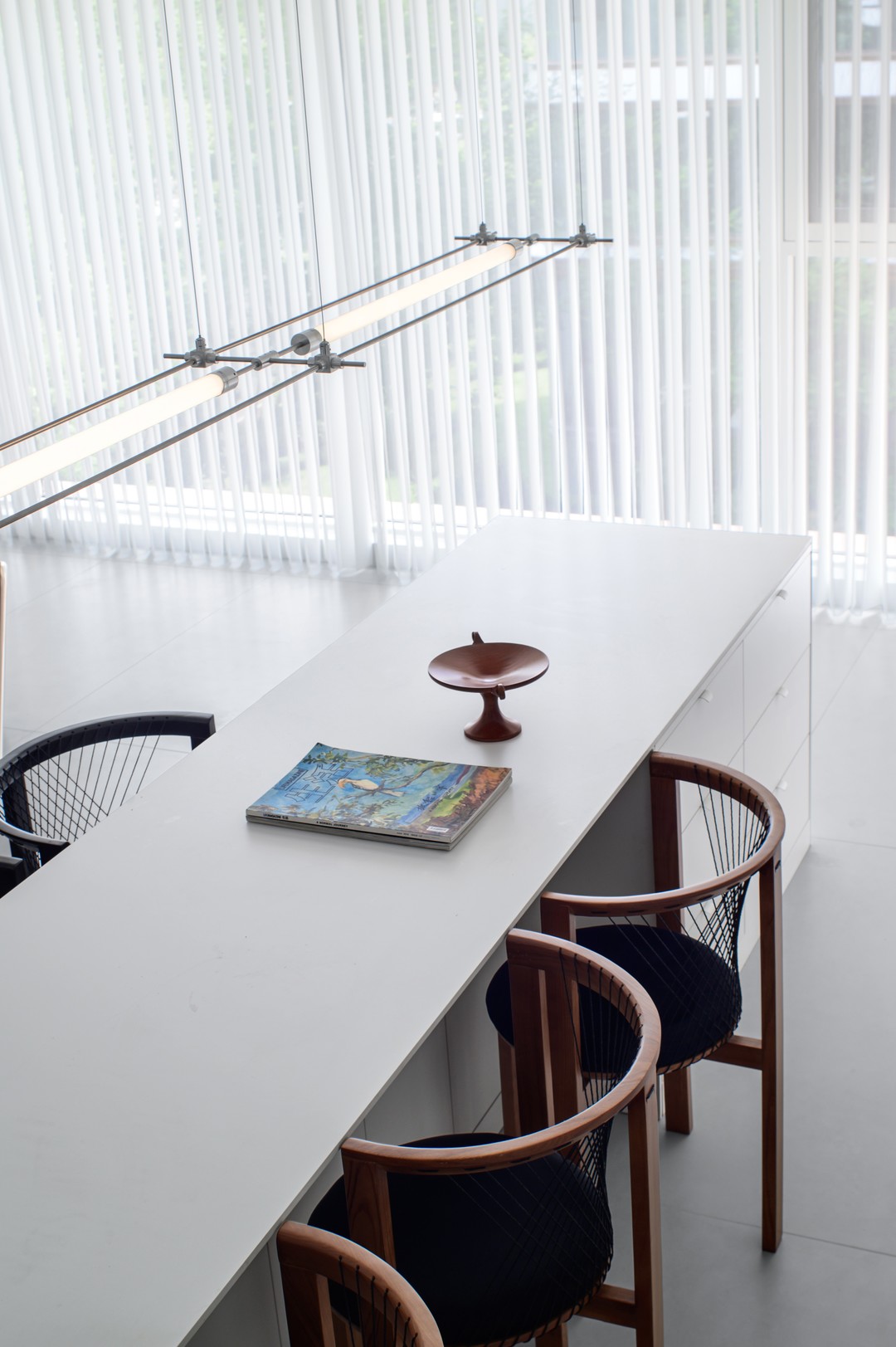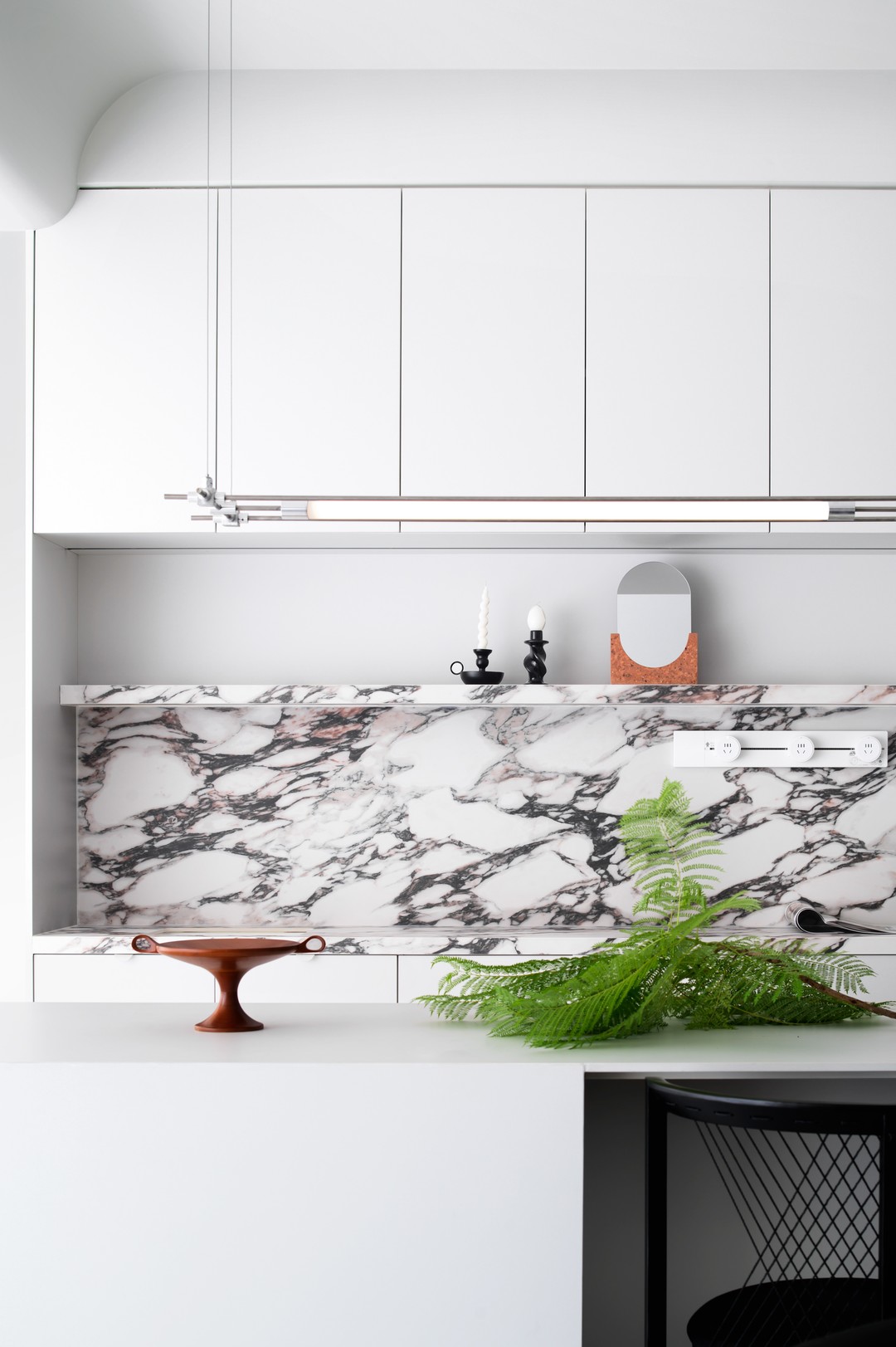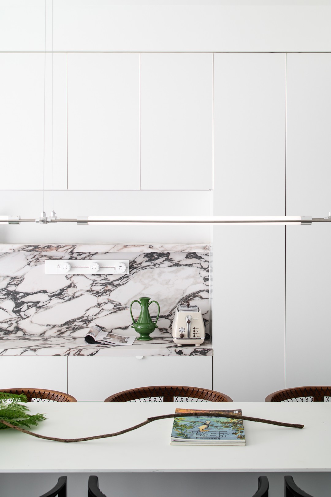 餐岛台背后的操作、展示柜则进一步强化了空间的实用性。这一设计巧思不仅提供了额外的储物空间,同时为业主创造了个性化的展示空间。