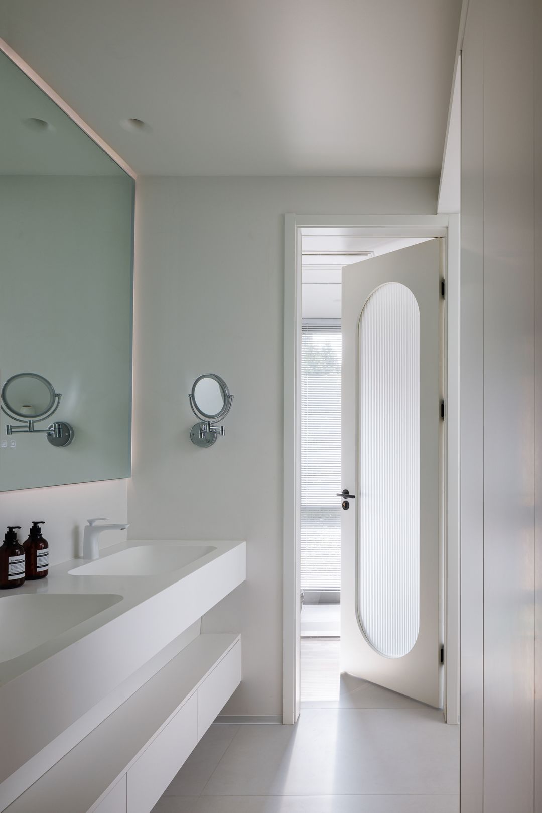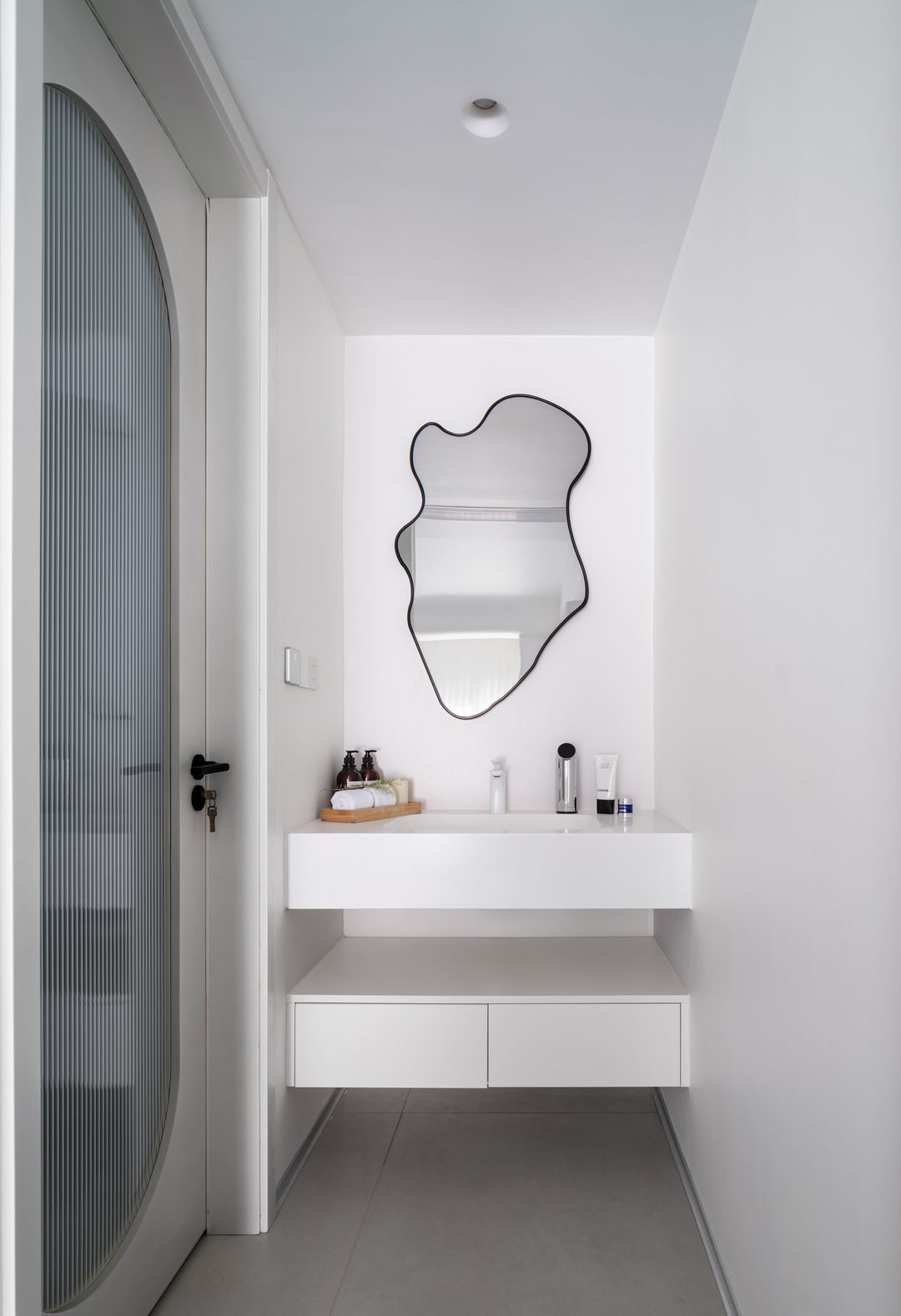 主卫做的干湿分离,超大的一体双台盆,正面贴的也是一整面大镜子,满足洗漱梳妆的同时也扩宽了过道空间。