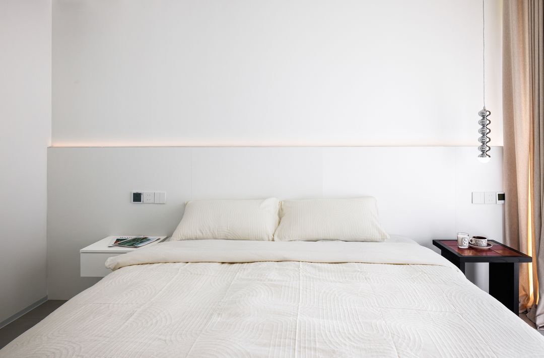 干净素雅的主卧空间,静下心来即可入睡。主卧空间的设计注重舒适性与实用性,拥有宽敞的盥洗区,配置双台盆、马桶淋浴间和衣帽化妆间,为业主提供了私密而便利的功能空间。