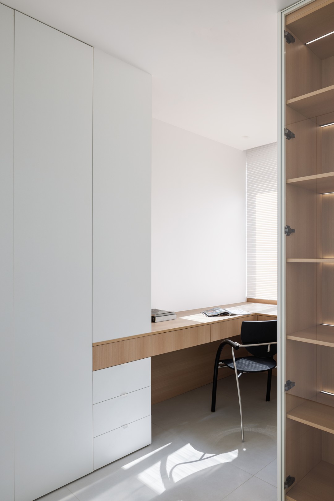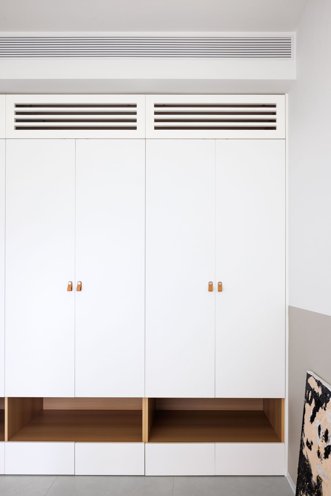 衣柜上下分段,上面考虑空调回风,做了隐形的处理,下面考虑开放,让儿童放置以后的玩具或书籍等,从小养成良好的收纳习惯。