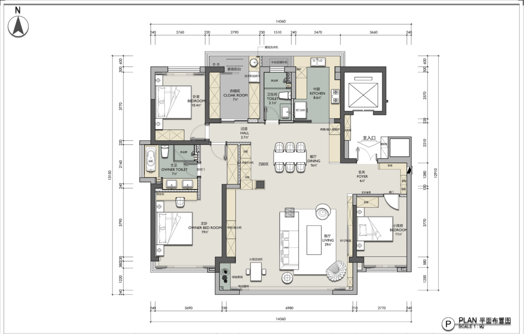 2.客餐厅位置的一堵厚墙改薄,把原来给主卧衣帽间的空间一分为二,一半给到餐厅,一半给到卧室。增加了餐厅的使用空间。