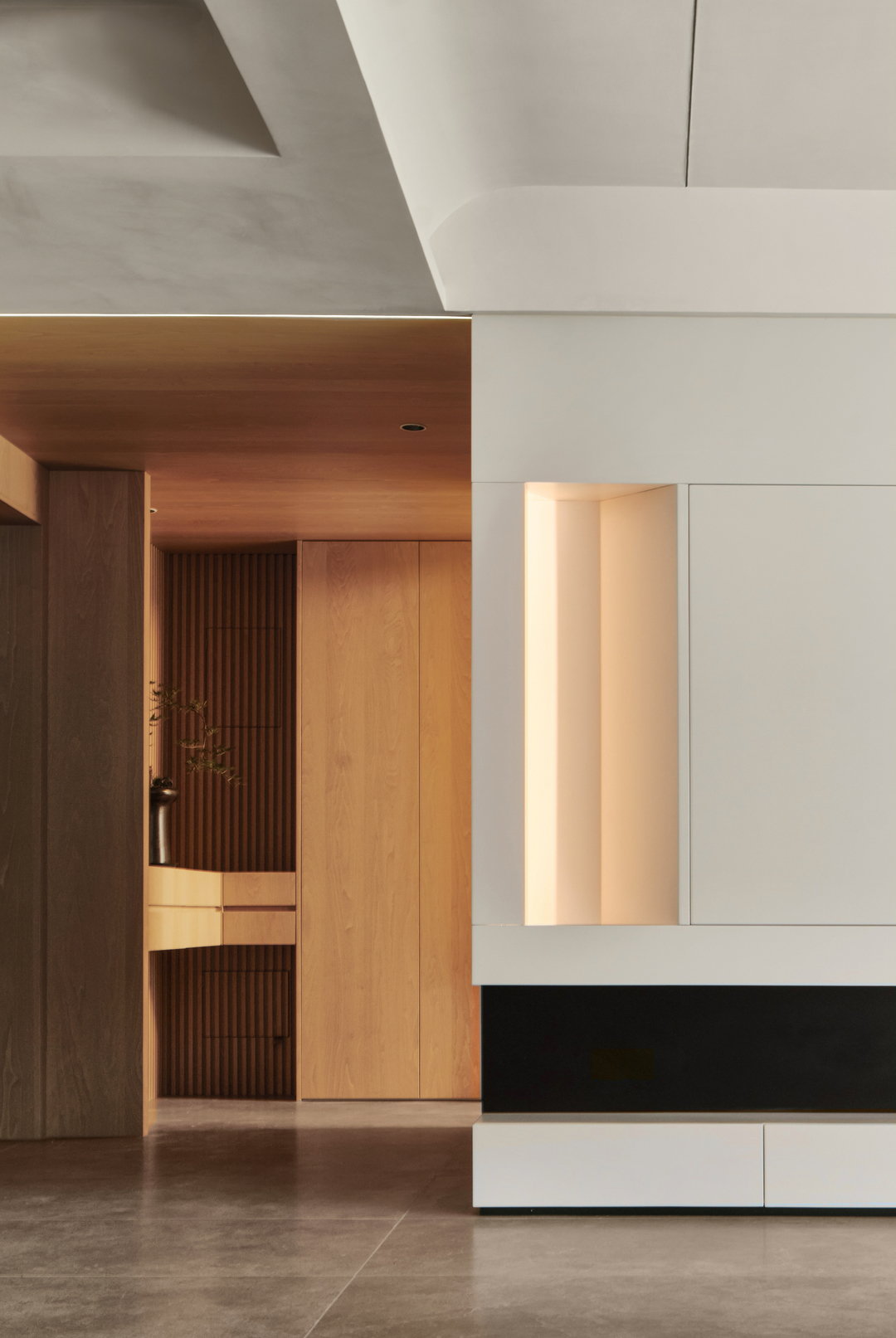 电视背景墙也是客厅的重要焦点之一,将造型和储物空间融合起来。在斜面设置一个切角,形成一个壁龛,增添电视背景墙的丰富性。