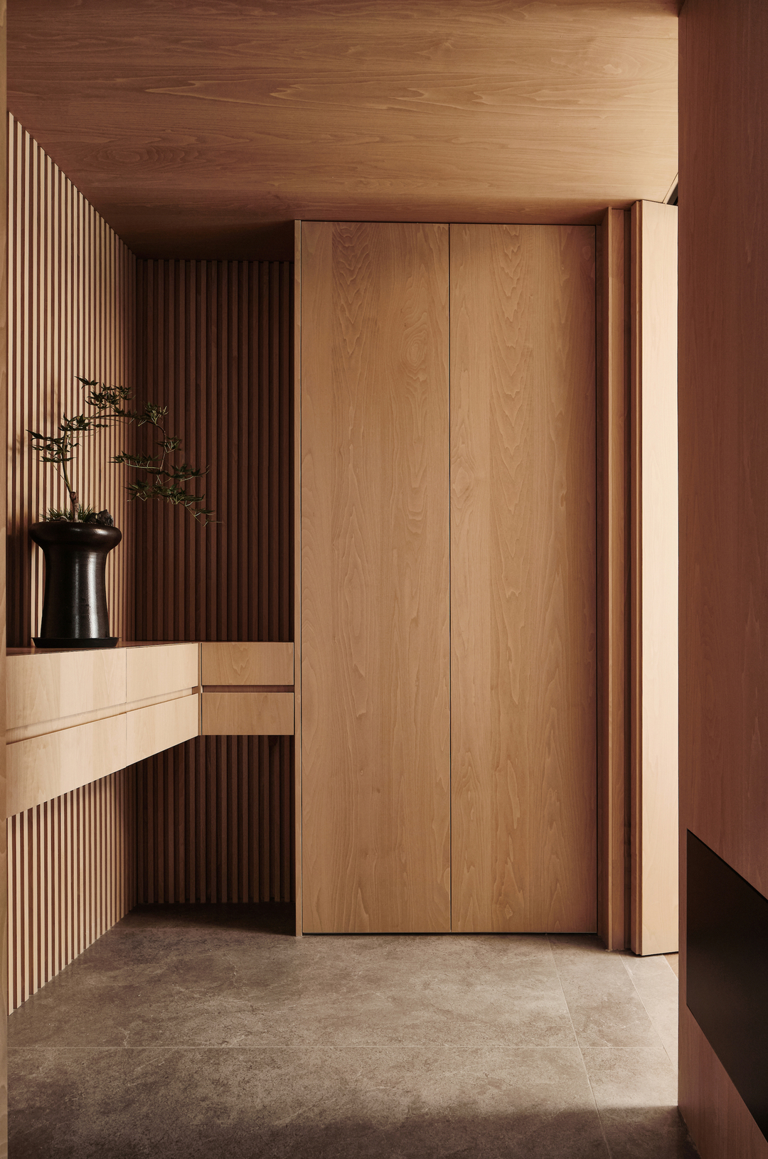 木纹色简约玄关,充满了自然与时尚的融合。整个玄关以木纹色为主调,给人一种温暖和舒适的感觉。同时,简约的设计以及木质格栅让整个空间更加整洁和有序。
