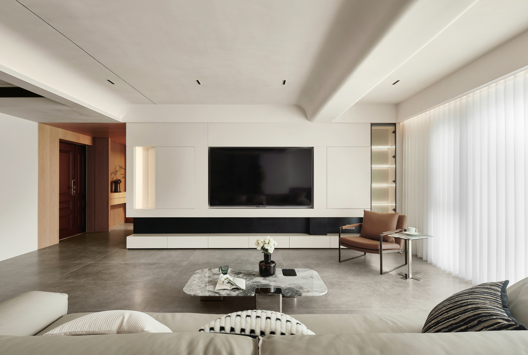 现代简约客厅的布局以空间感和收纳为重点,提高空间利用率,使整个客厅显得明亮宽敞。