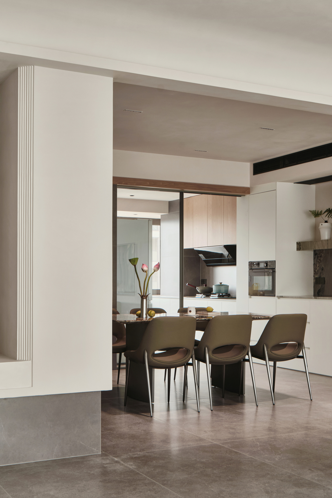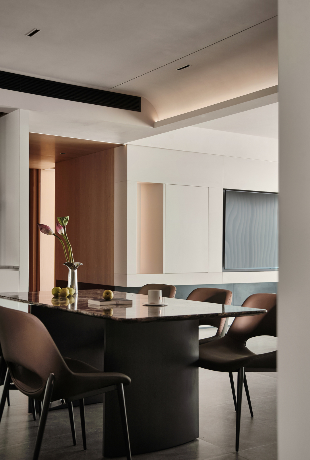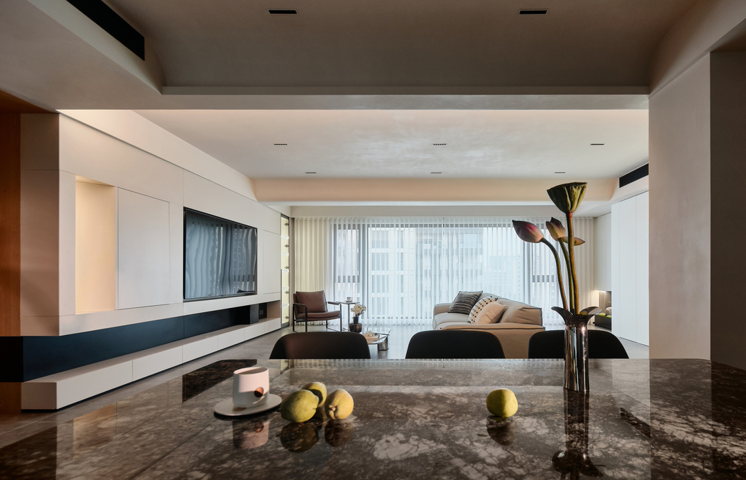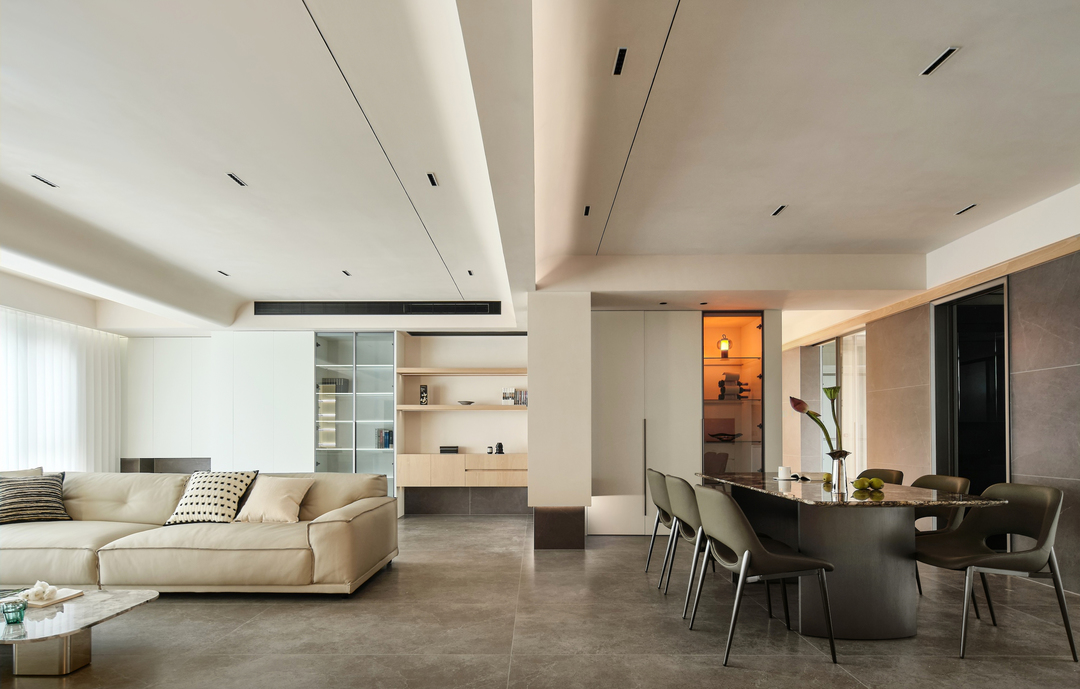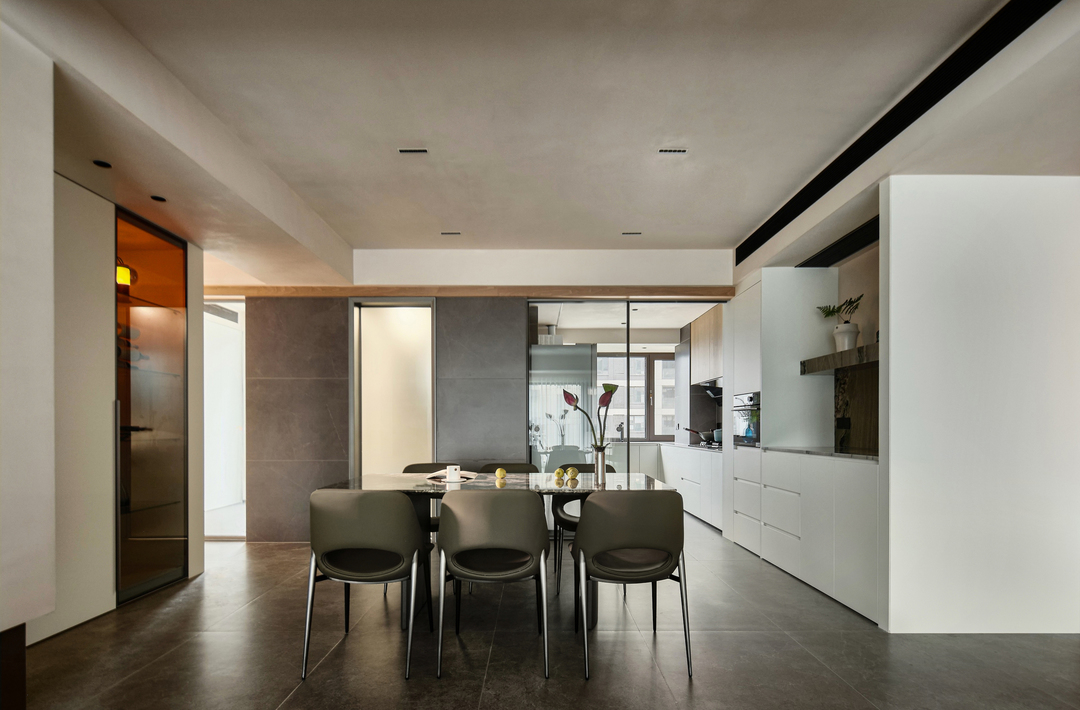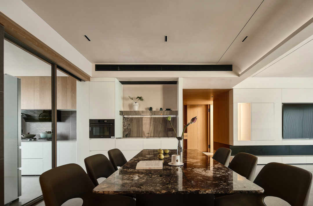 餐厅区域同时具备了操作、用餐、储物的功能,与客厅紧密相连,创造了一个开放和通透的环境。不仅增加了餐厅的通透、宽敞感,也方便了家人或朋友之间的交流和互动。