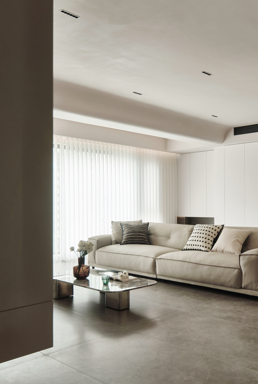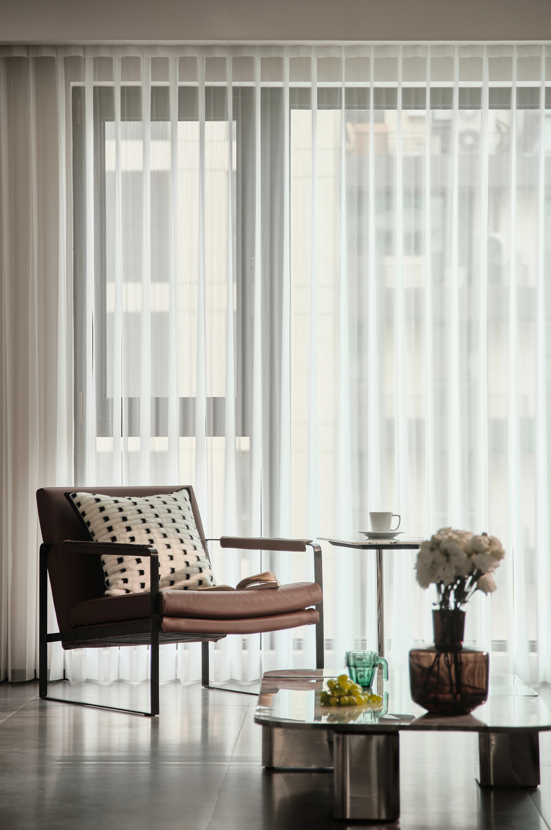 落地窗为客厅带来了丰富的自然光线,舒适的沙发和造型茶几提供了一个悠闲的休憩区域,供家人和朋友们聚会。阳台墙角位置设了小景观绿植,为客厅增添了一抹生机和艺术气息。