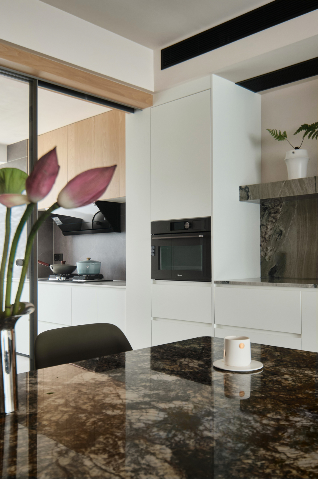 餐桌另一边则是西厨操作台,台面由一整块大理石切割而成,确保其整体性。台面下则是储物抽屉。