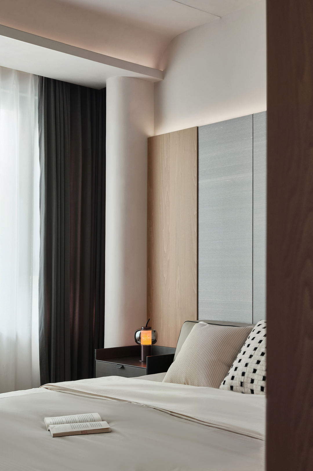 主卧呈现简约时尚的整体氛围,室内的弧形造型让柱体和梁体巧妙融合,避免了户型的缺憾,彰显和谐的美感,让整体空间更加流畅。