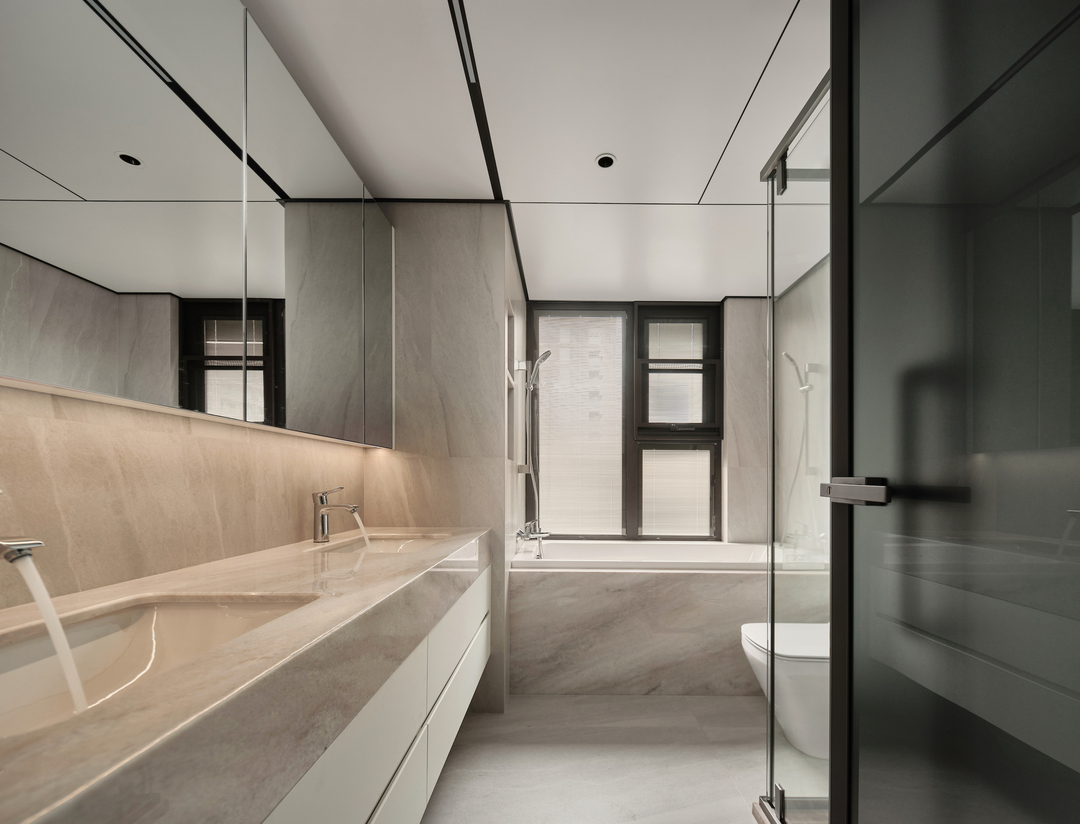主卧套间中设置了四分离卫生间,将洗手台、马桶、淋浴间和浴缸等功能区分开,使每个功能区都能够独立运作。