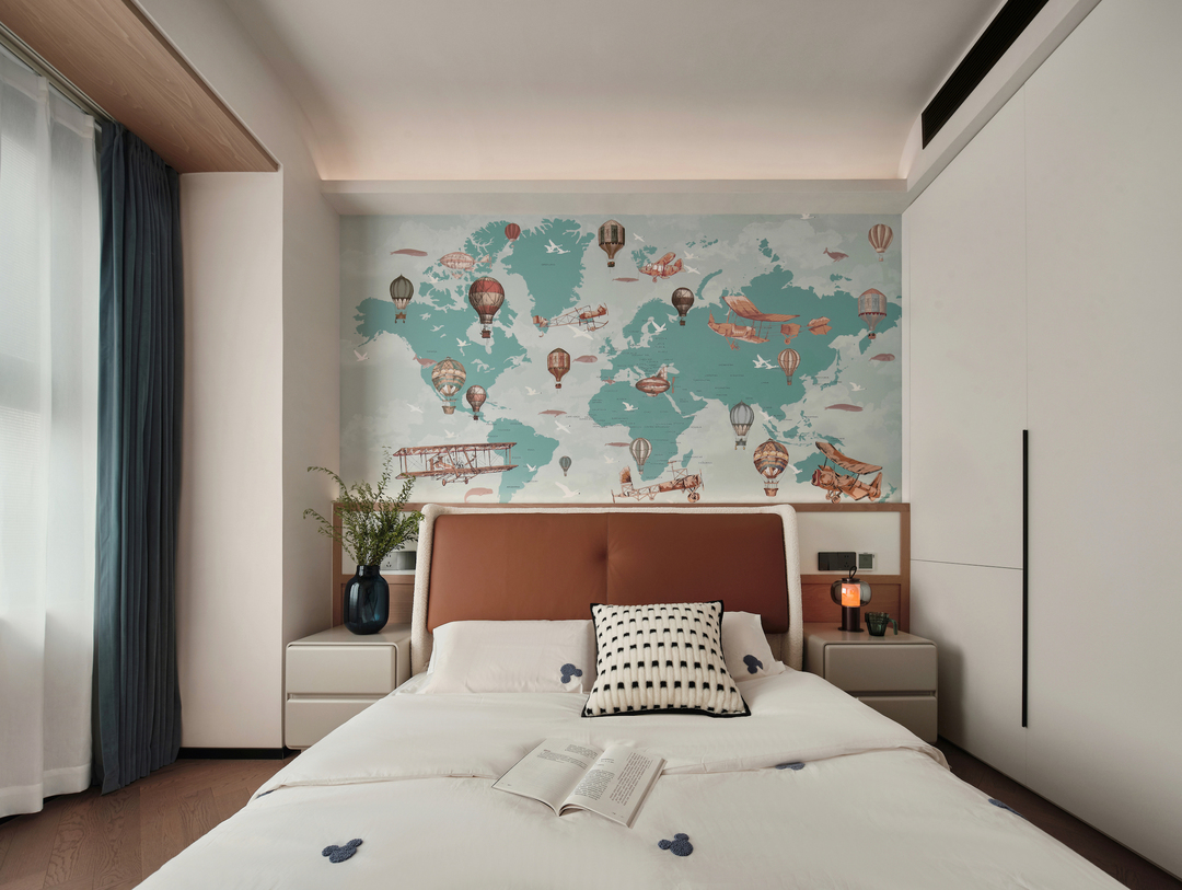 儿童房整体采用蓝色调,可以让孩子感到安心和放松。床品、墙画及窗帘很好地呼应在一起,为房间增添一丝清新的氛围。
