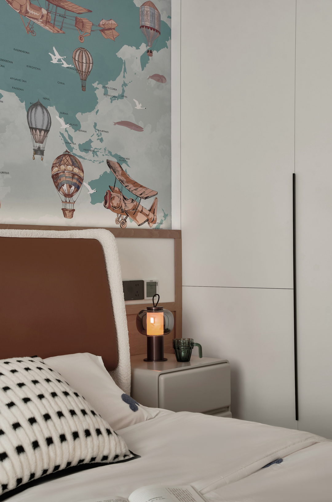 儿童房的床品边角均采用布艺包裹,包括床头柜。不仅具有保护功能,也增加了房间的柔和感。让孩子在屋内更加舒适和安全。