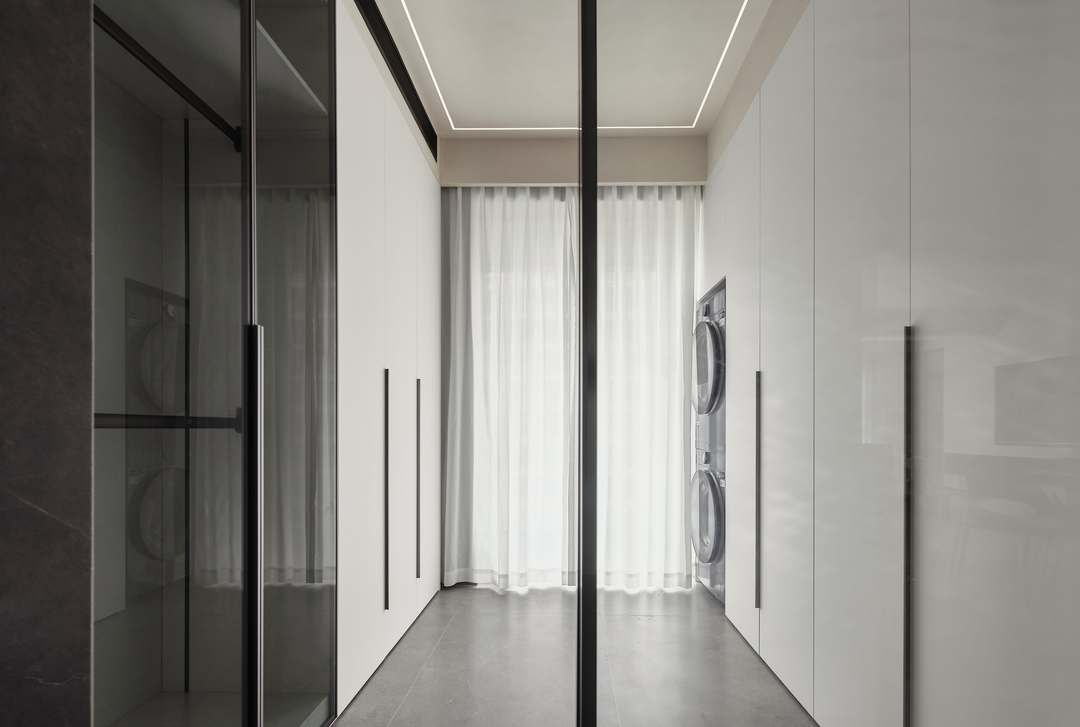 衣帽间兼顾洗衣、晾晒功能。浅色调简洁,玻璃门的设计更增加了通透感。