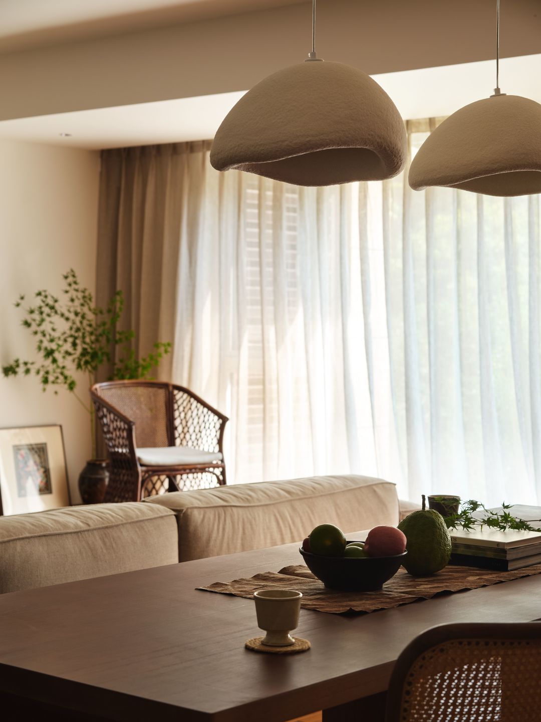 原户型是4+1的房型,户型相对方正,坐北朝南,通过沟通将结构稍微做了些改造和调整,将客厅公区再扩大化,把分隔较小零碎空间整体化,改造出一个跟客餐厅互动的多功能厅。从而也达到南北通透,空气对流。