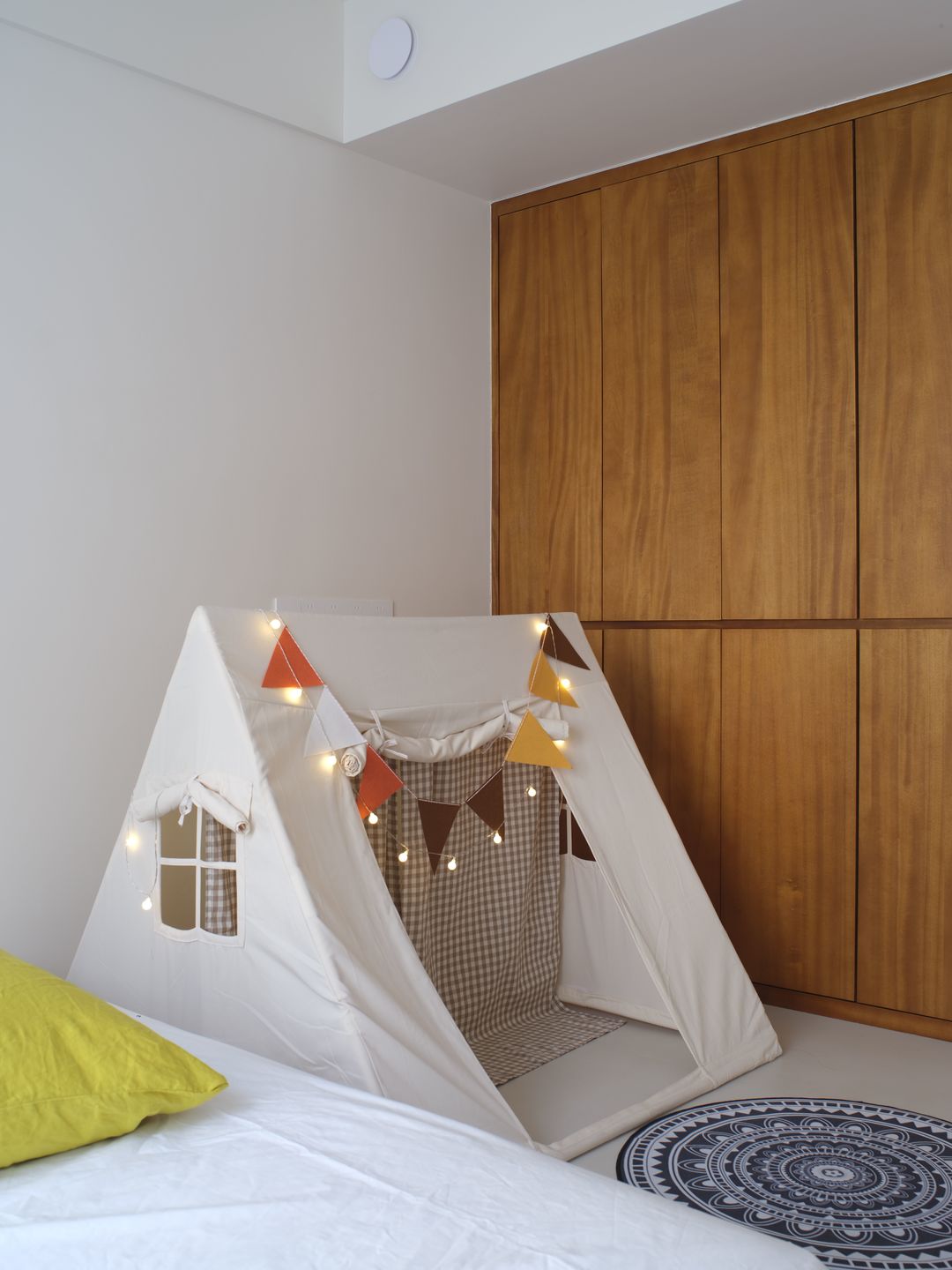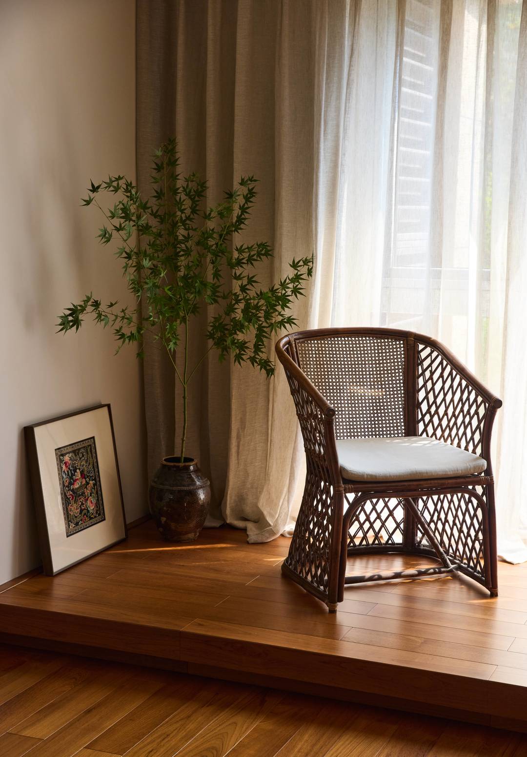 这次的主卧套房设计是去痕的设计,感觉没设计,但又给人的感觉是精心设计过。床头没做多余的背景,棉麻的成品床,原木的边几和衣柜,充分表达居家睡觉的慵懒感。周全的功能设计有休闲书房,写作,盥洗等。