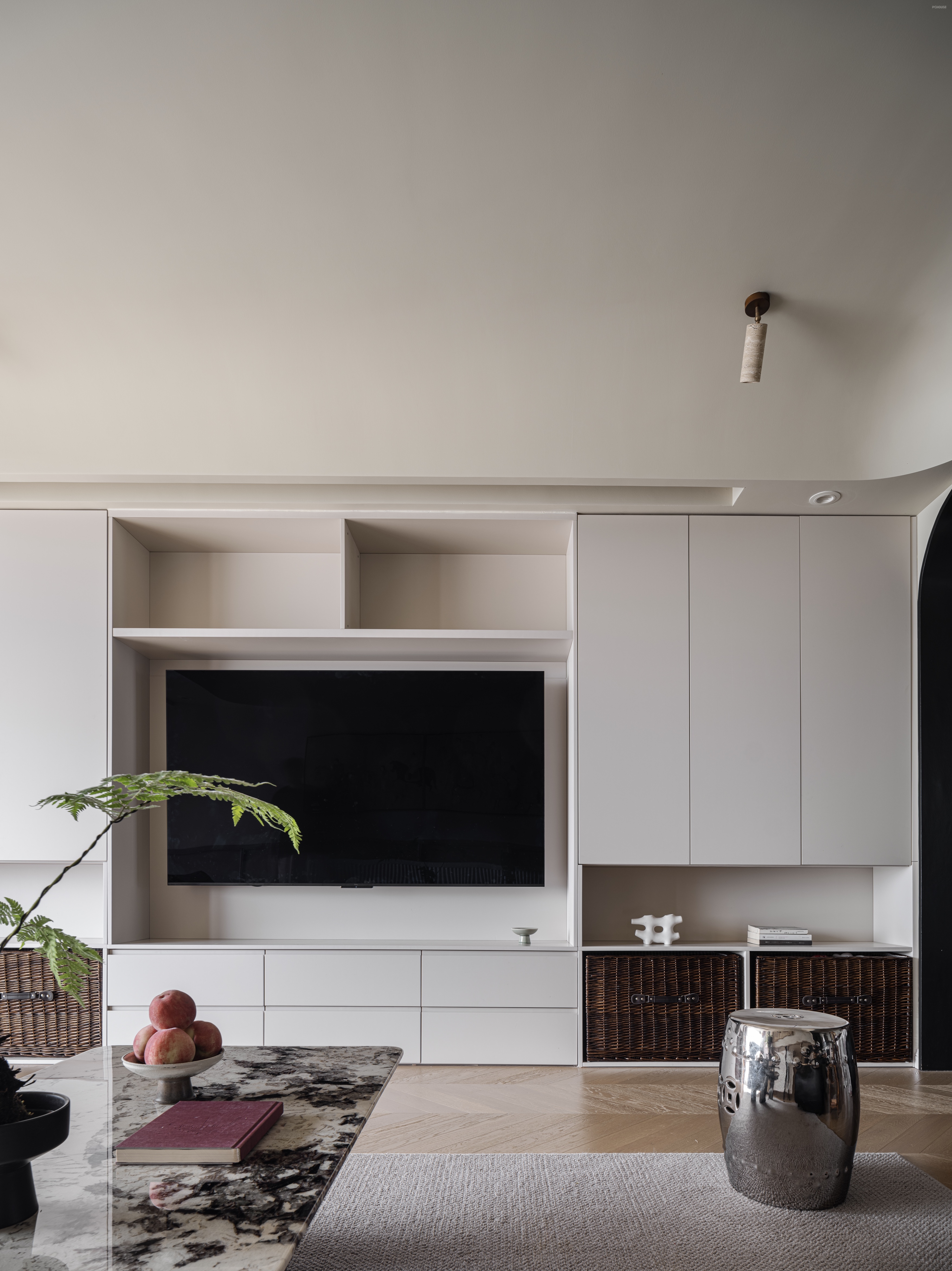 全屋连通开放式布局,整个空间以奶白色和胡桃色为主色调,给人一种沉稳大气的感觉,让现代、复古、中式风格碰撞出别样韵味。
