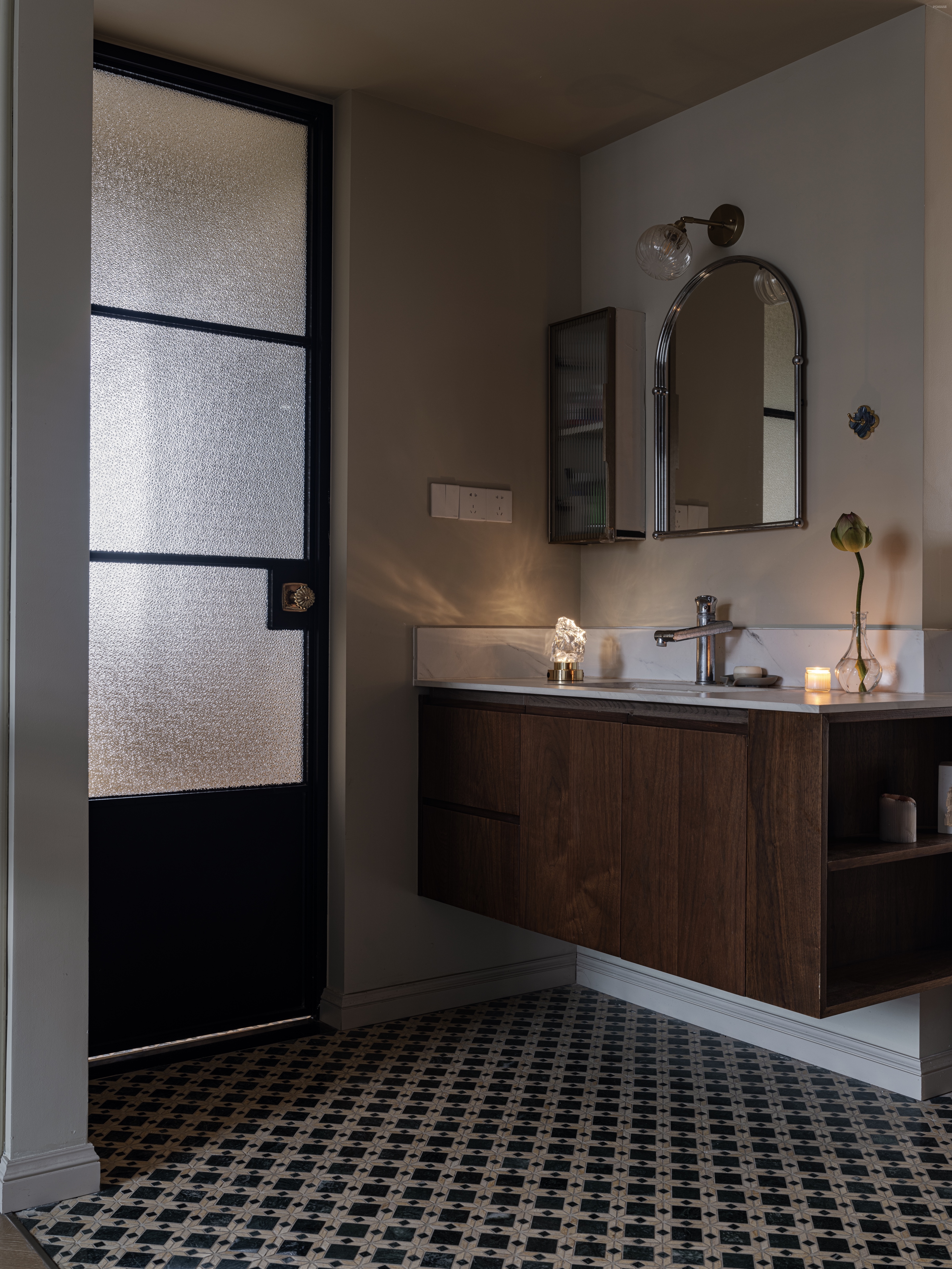 新中式卫生间还注重实用性,全瓷花砖搭配不能少。