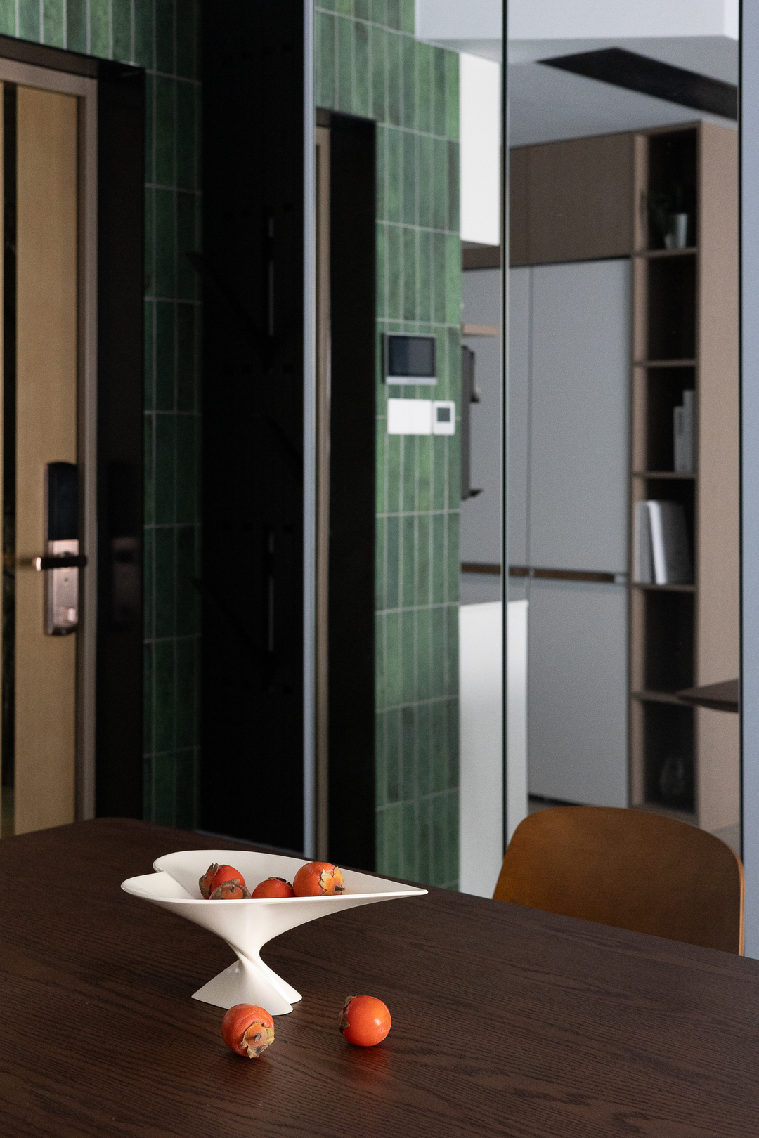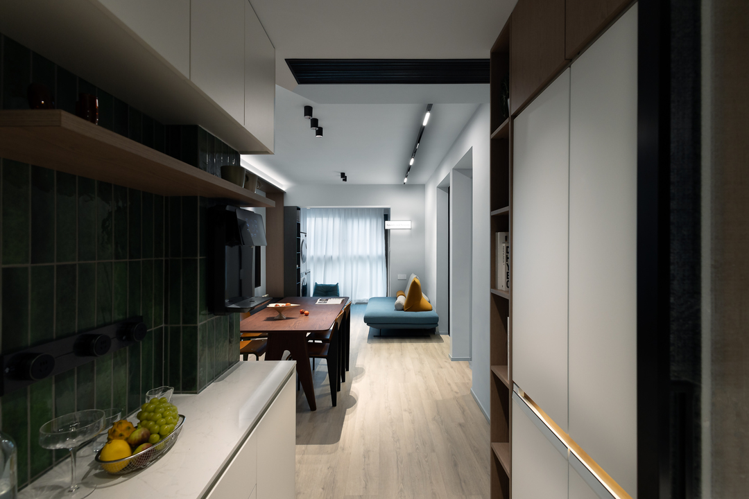 原本狭小的入户区域置入了一面联动到客厅的定制柜体,满足玄关的收纳需求。镜面的设计方便不占地。另一侧连带做斜切的换鞋凳,上方的钢琴键挂钩可以随心所欲悬挂任何的包袋帽子。