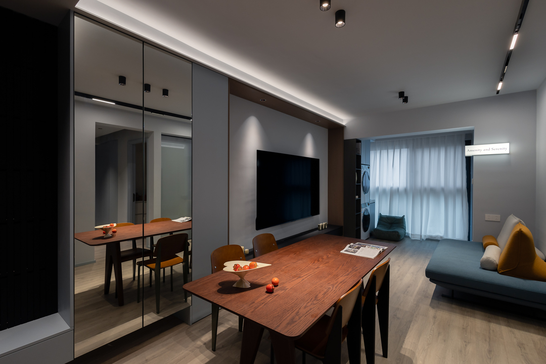 LDK的布局让厨房、客厅、餐厅畅通无阻,1.8米的大餐桌可以承担写作业、办公、备菜、和最多容纳八人聚餐的场景。