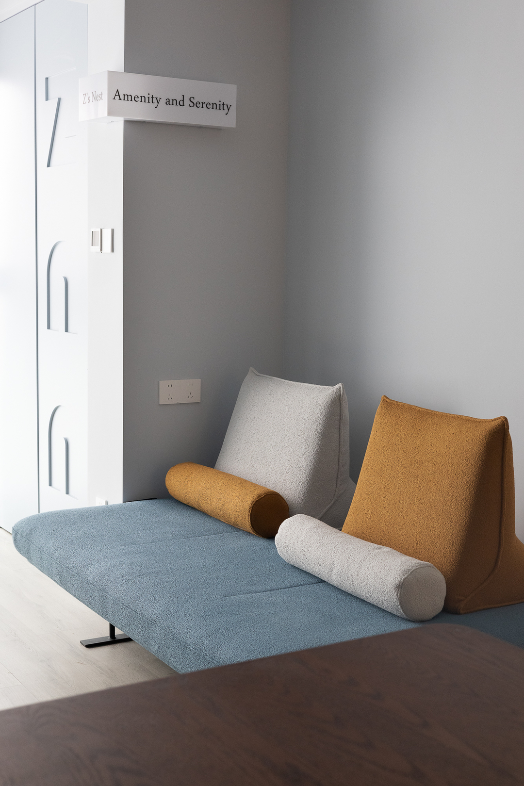 从入户门到阳台6.8米的进深足以释放全家最开阔的空间让两个小朋友玩耍自如。原始阳台设备间拆除,用一扇隐形门隔断成储藏室。空间更为规整。一些大件的杂物、清洁用品也有了容身之处。储藏室对面规划洗衣房,烘干机,洗衣机统统塞下。阳台顶面安置攀爬架,小朋友可以在这里攀爬玩耍。
