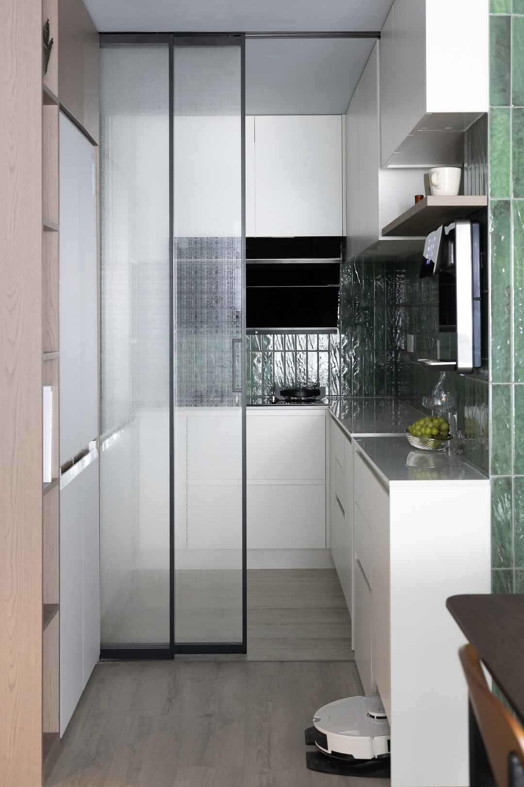 极窄的玻璃轨道移门,嵌入柜体不占空间,随时可以隔绝油烟又能保持整体空间的通透
