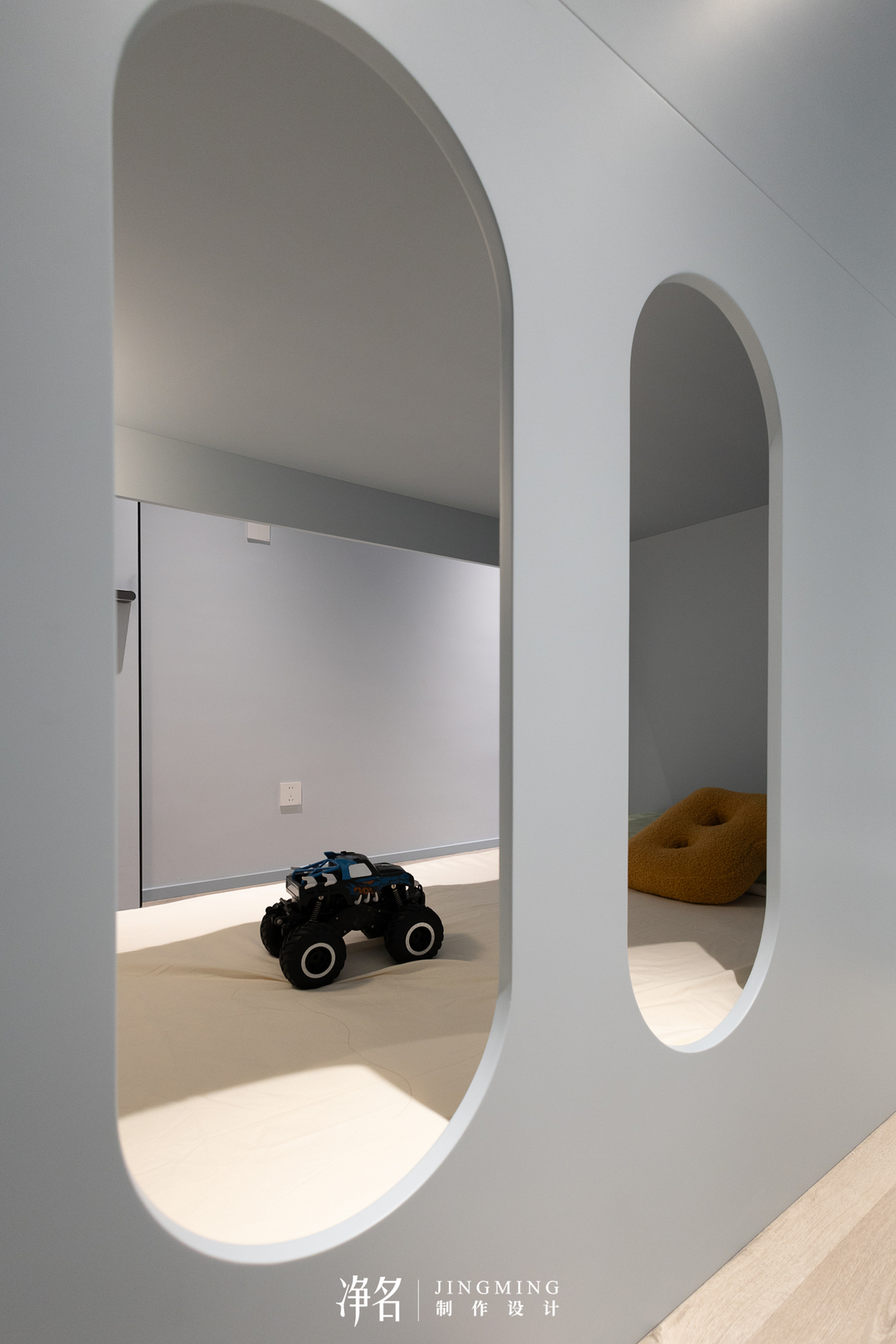 让儿童房变得稍微宽敞一点,然后利用窗户的分割,区分两个空间,让两个卧室都有自然采光。床铺的设计采用错层的概念,一个房间利用下铺区域,一个房间利用上铺区域,中间有独立的分割开,各自有独立的卧室门。中央空调也增加了一个风口引入到小朋友房间。实现一房变两房,有互动又相对独立。