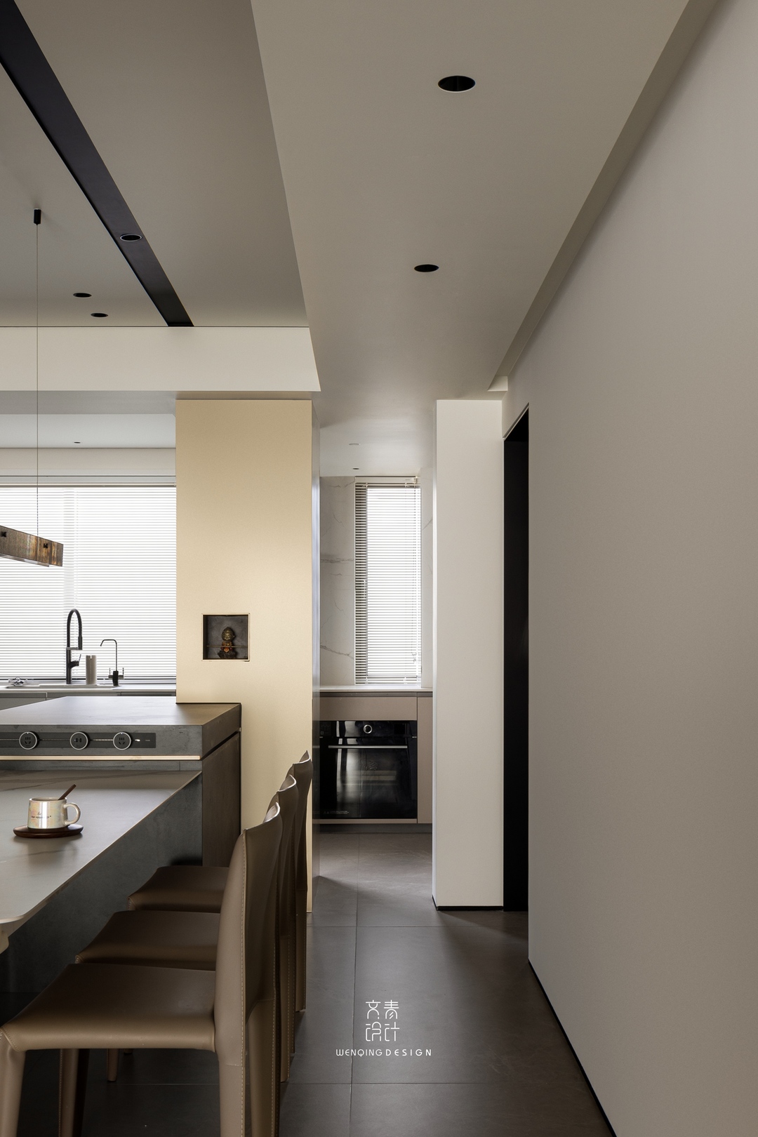 公区顶部运用了一条贯穿整个空间的长条黑色体块,每个功能区域之间既独立、又有联系,黑色长体块一直延伸,成为空间透视中的视觉中心。