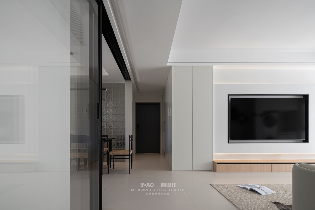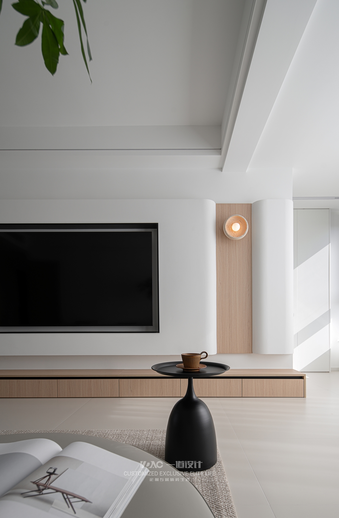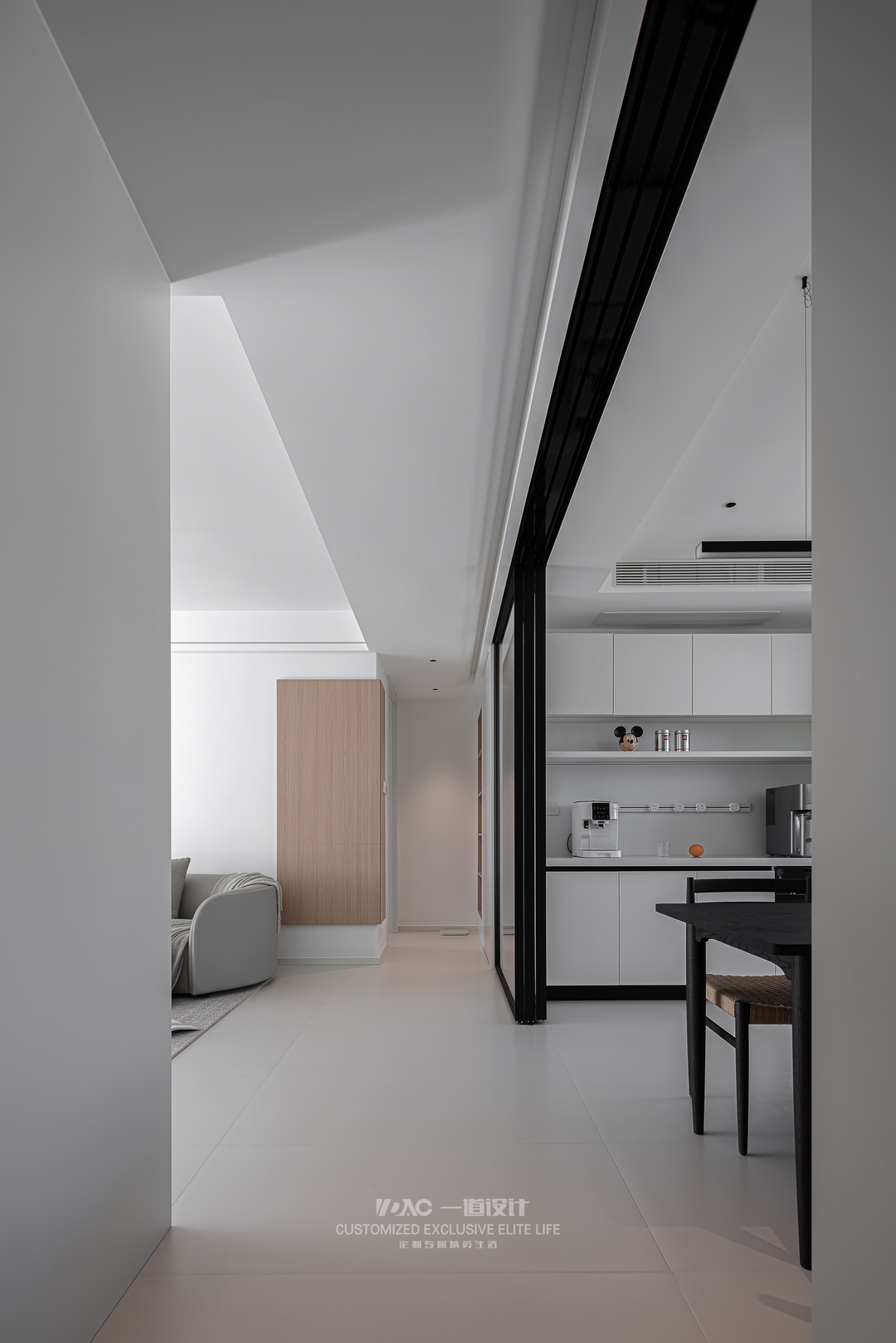 整个厅没有做过多装饰的痕迹,墙面以大面积留白为主,辅以局部点缀,营造出简约而不失格调的空间氛围。考虑到层高没有做满吊顶,顶面选择极简吸顶灯辅以四周的灯带。