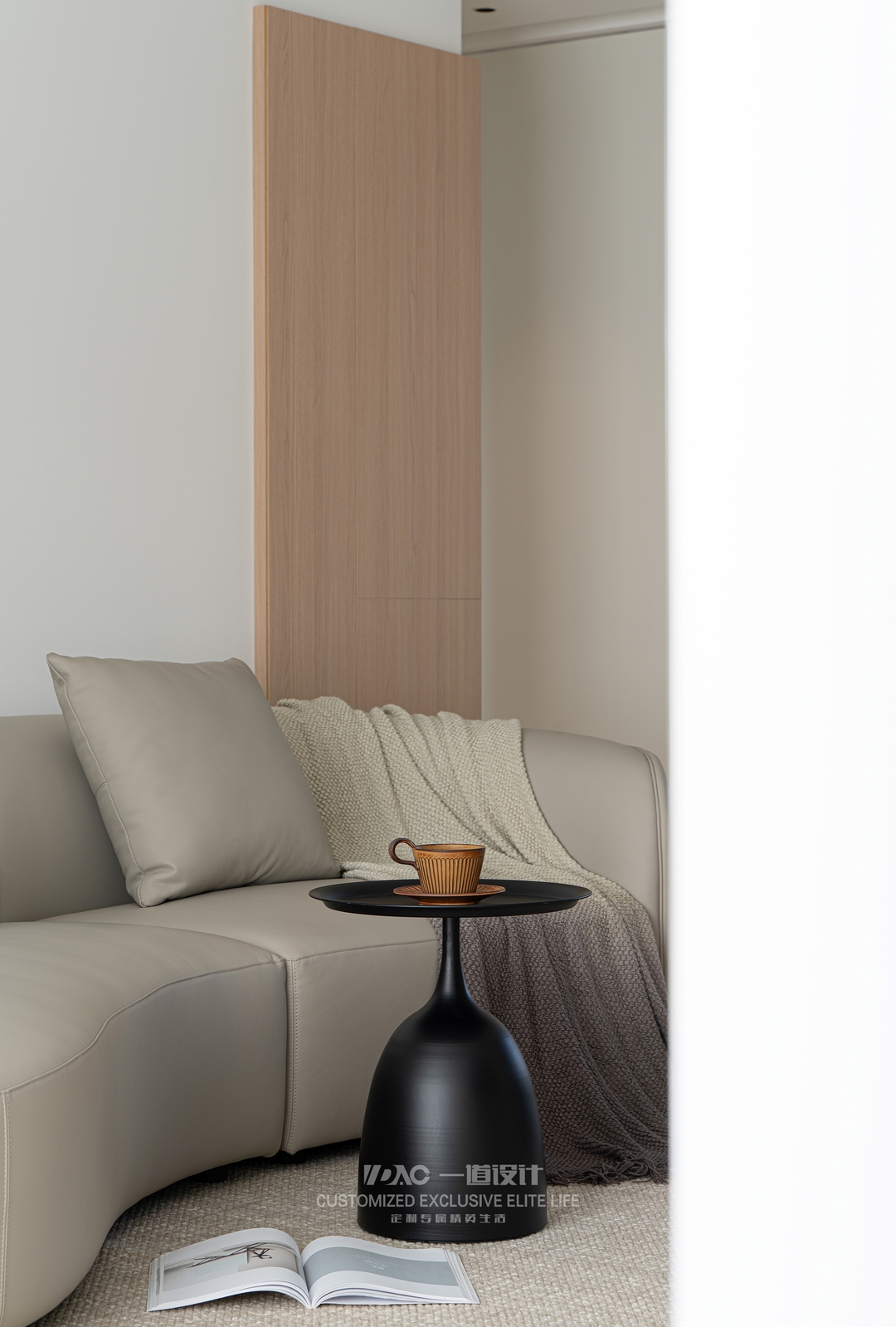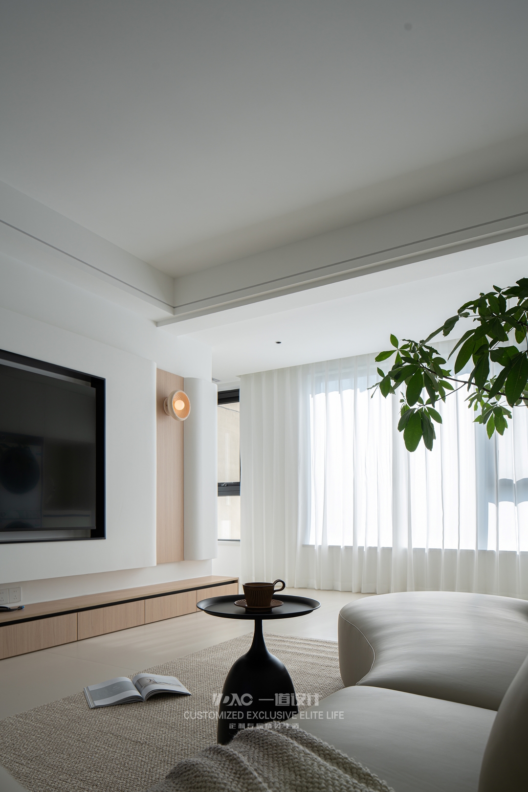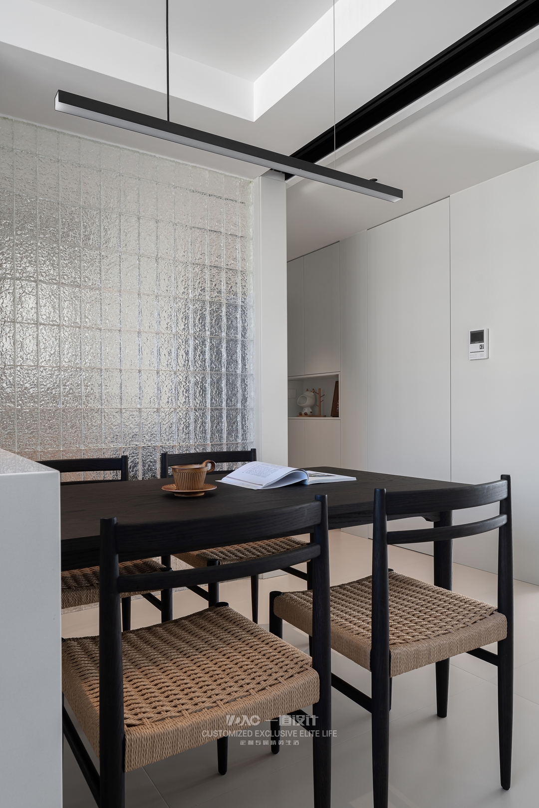 整个厅没有做过多装饰的痕迹,墙面以大面积留白为主,辅以局部点缀,营造出简约而不失格调的空间氛围。考虑到层高没有做满吊顶,顶面选择极简吸顶灯辅以四周的灯带。