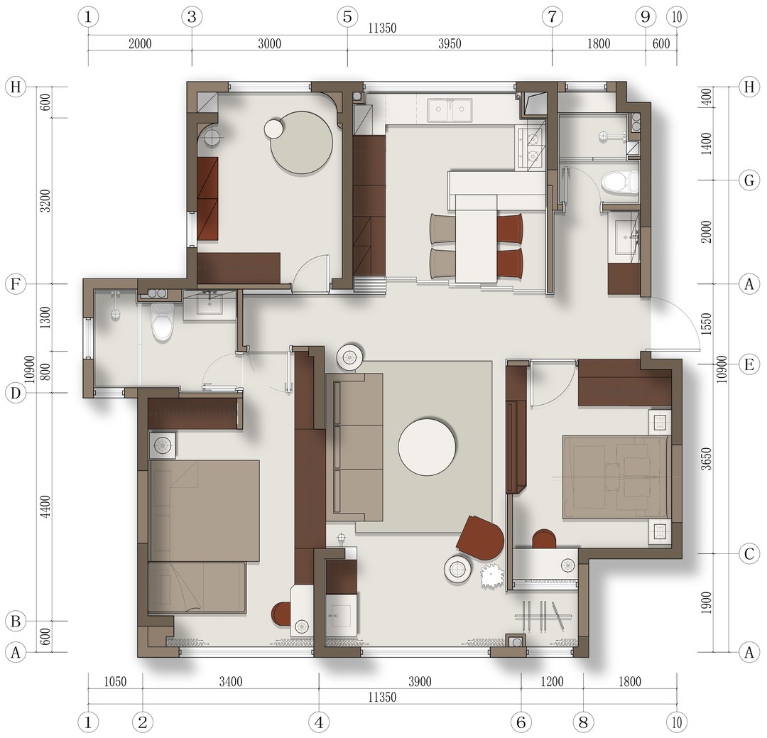 原入户空间缺乏收纳功能,巧妙利用原有墙体结构,设计了一整面入户衣柜。衣柜与父母房衣柜采用背靠背布局,既优化了空间利用率,又同步解决了两个空间的储物需求。