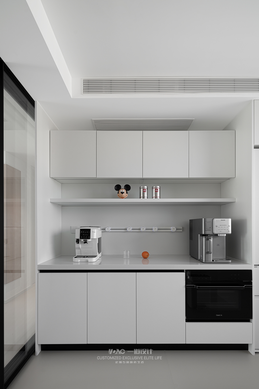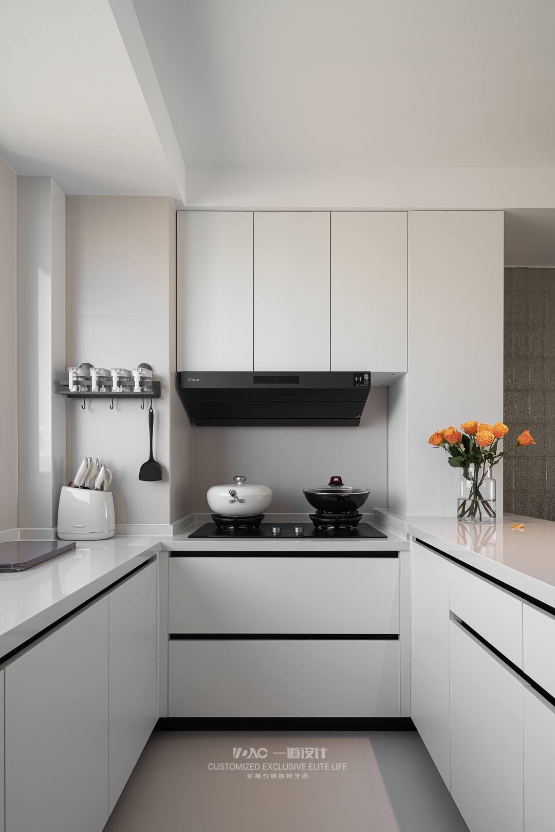 以白色为主调的极简风厨房,白色基调对强迫症业主很友好,搭配隐藏式收纳设计,营造出整洁明亮的烹饪环境。