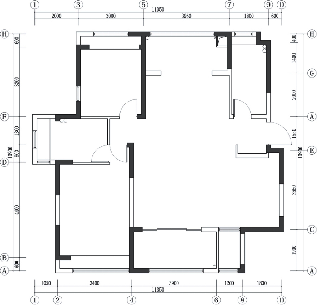 1.拆除红色区域,拆除飘窗,扩大房间,增加使用面积。