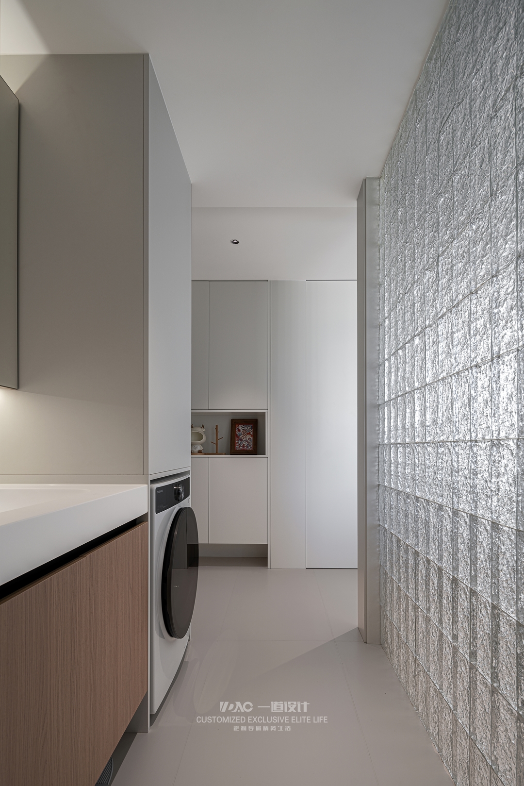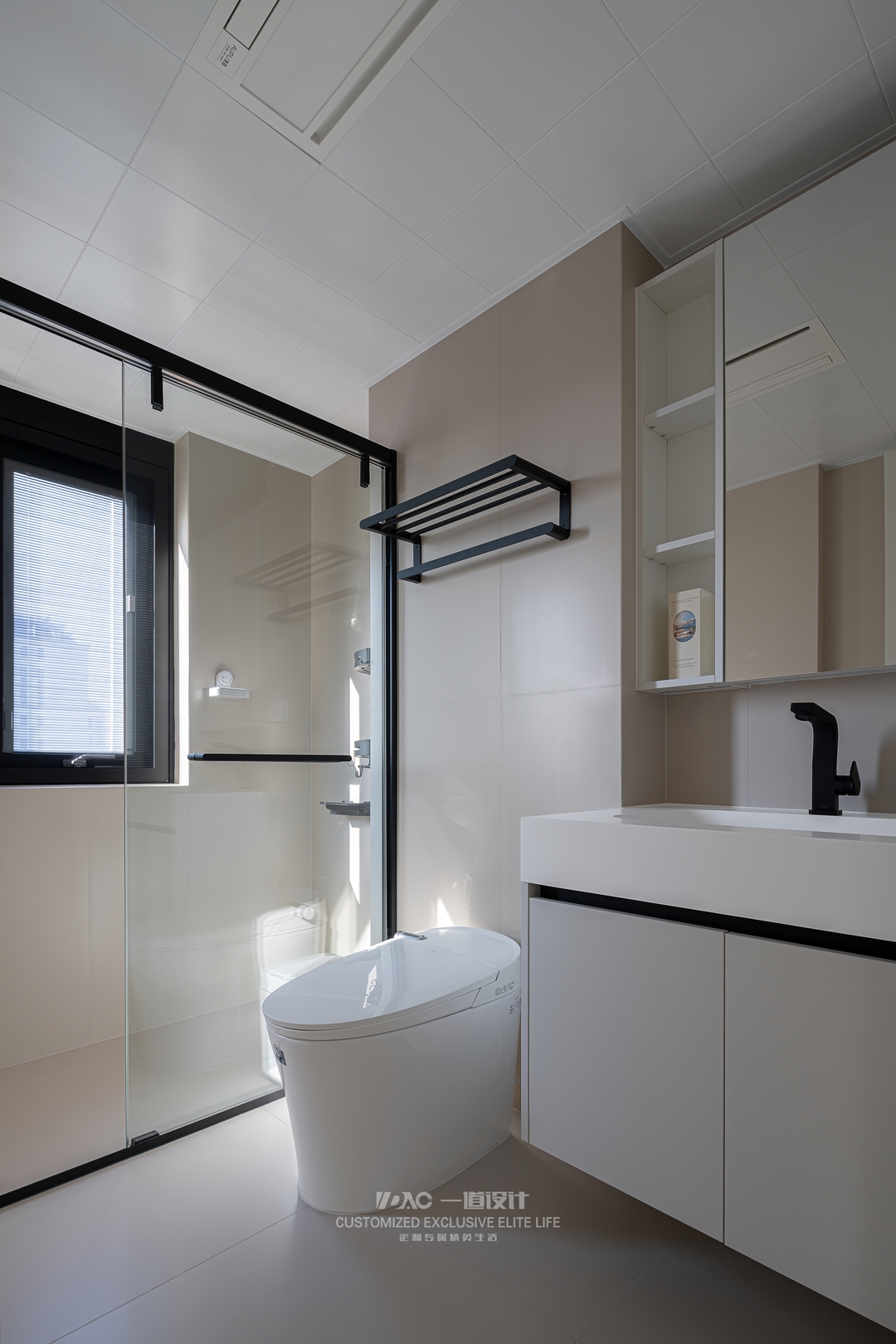 卫生间墙面和地面通体采用大规格白色瓷砖铺贴,搭配同色系美缝,营造出纯净明亮的空间感,洗漱区采用定制的一体式台盆,台面与盆体无缝衔接,既避免了卫生死角,又提升了整体美观度。