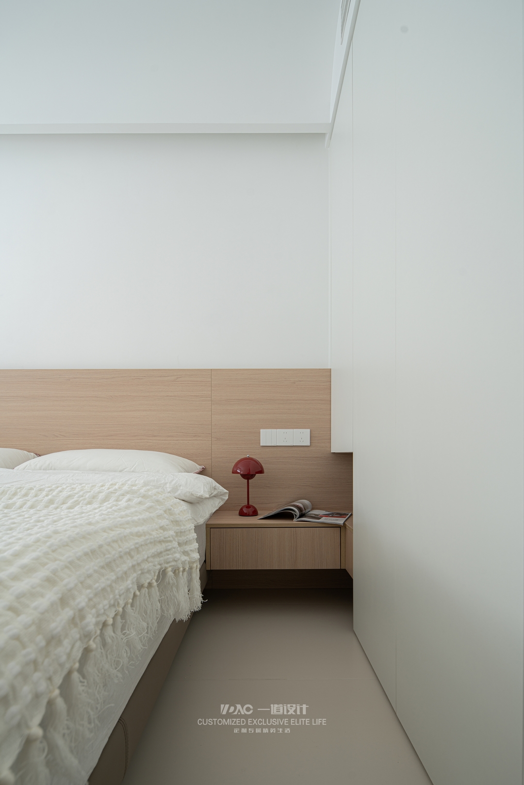 床尾设计了一整面多功能收纳柜,采用木色与白色拼接设计,通过镂空与封闭式柜门的巧妙搭配,既满足了大量收纳需求,又打破了视觉上的沉闷感。梳妆台延伸至飘窗上方,不仅扩大了使用台面,还创造了独特的空间延伸效果。