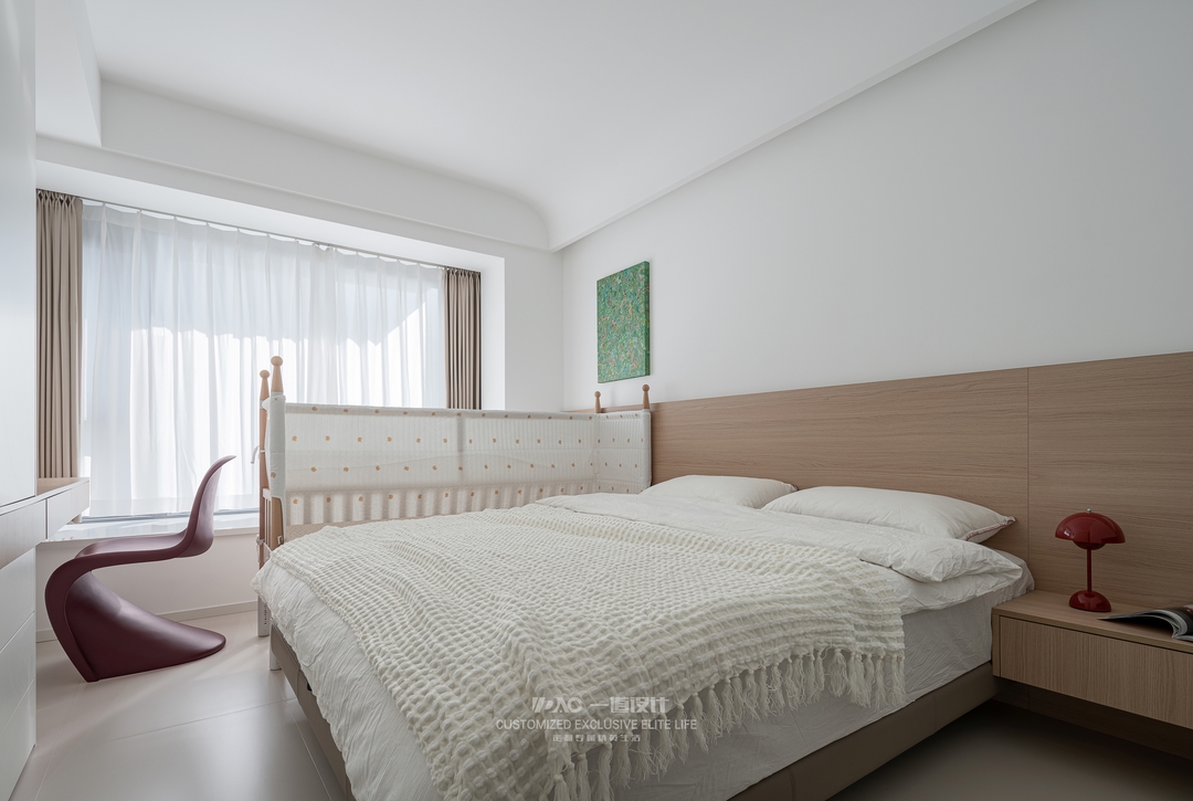 主卧增设了可拼接的儿童床,在确保父母大床舒适空间的同时,方便夜间照看孩子。