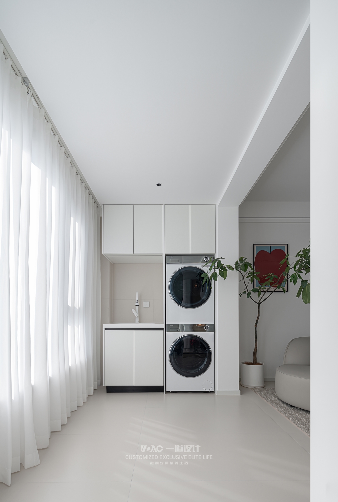 阳台空间采用功能分区设计:一侧规划为洗烘一体区,另一侧巧妙设置在客厅视觉盲区,作为生活晾晒区。这种布局既保证了日常晾晒功能,又确保了从客厅主要视角看不到晾晒衣物,完美兼顾了实用性与美观度。