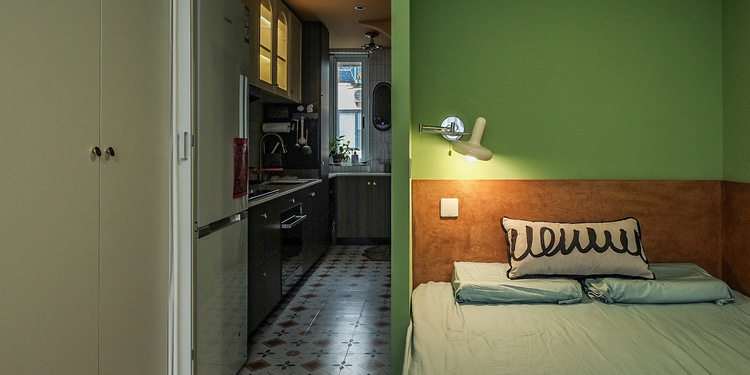 厨房卫生间空间布置在了整个房子的北侧,我用呼应地砖的橙色和绿色大面积的涂刷这个空间,让原本会显得闭塞狭小的空间有意思起来。从而可以忽视空间小的缺点。